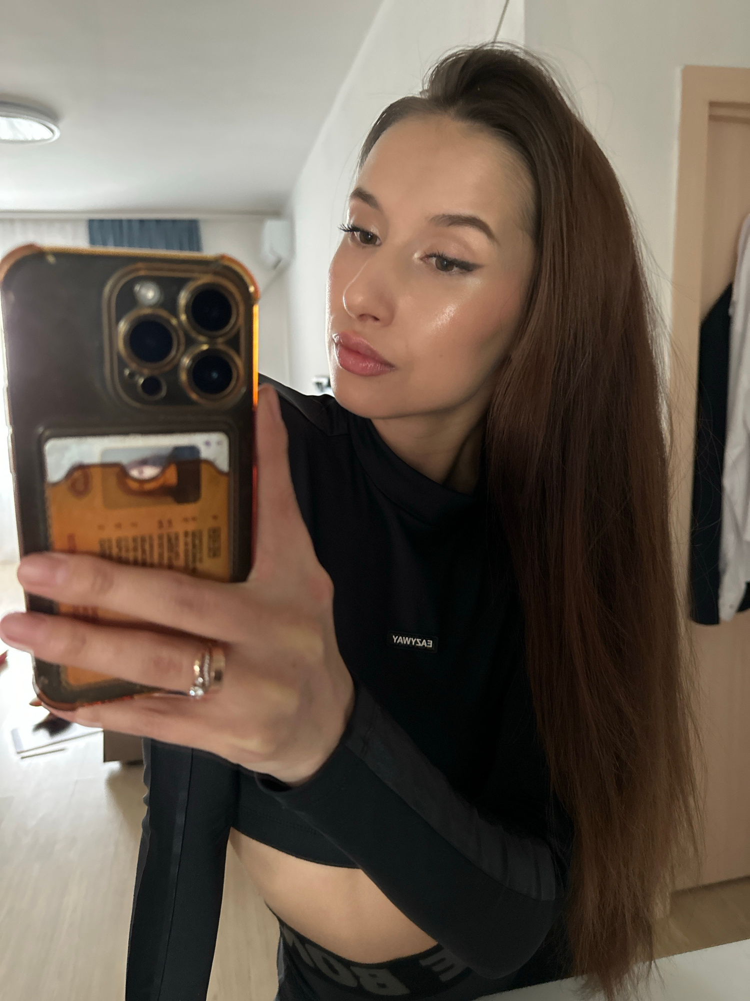 A woman is taking a selfie indoors. She is wearing a black long-sleeved top. Her hair is long and brown. She is holding a smartphone with a gold case in her right hand. A ring is on her finger. The baβ¦read more