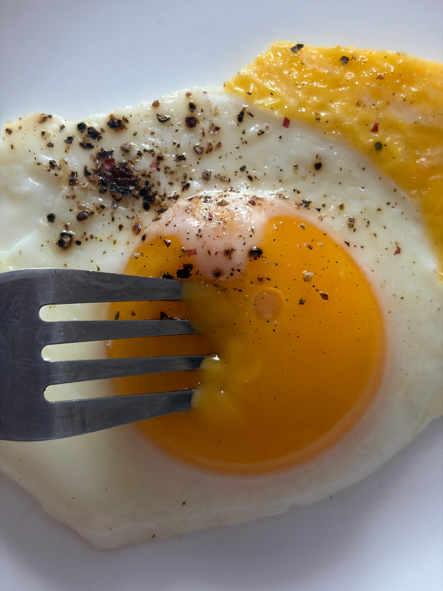 A close-up, high-angle shot reveals a fried egg sprinkled with black pepper on a white plate. A fork is inserted into the egg yolk. No location in Saint Petersburg, Russia is apparent.