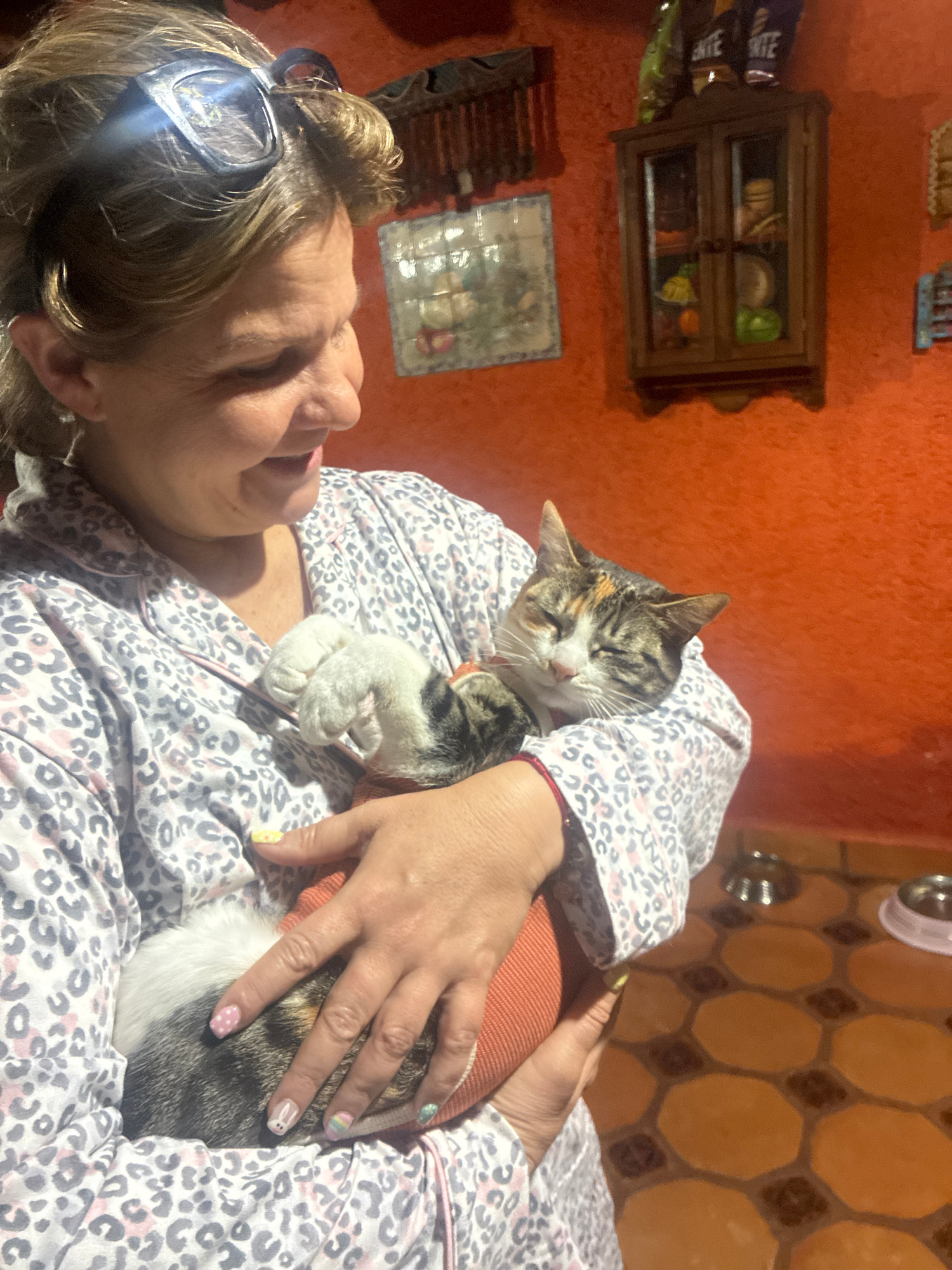 A woman in pajamas is lying down, with a cat sleeping on her chest. The woman has sunglasses perched on her head and is sticking her tongue out. The cat is a calico with white paws. The woman's nails…read more