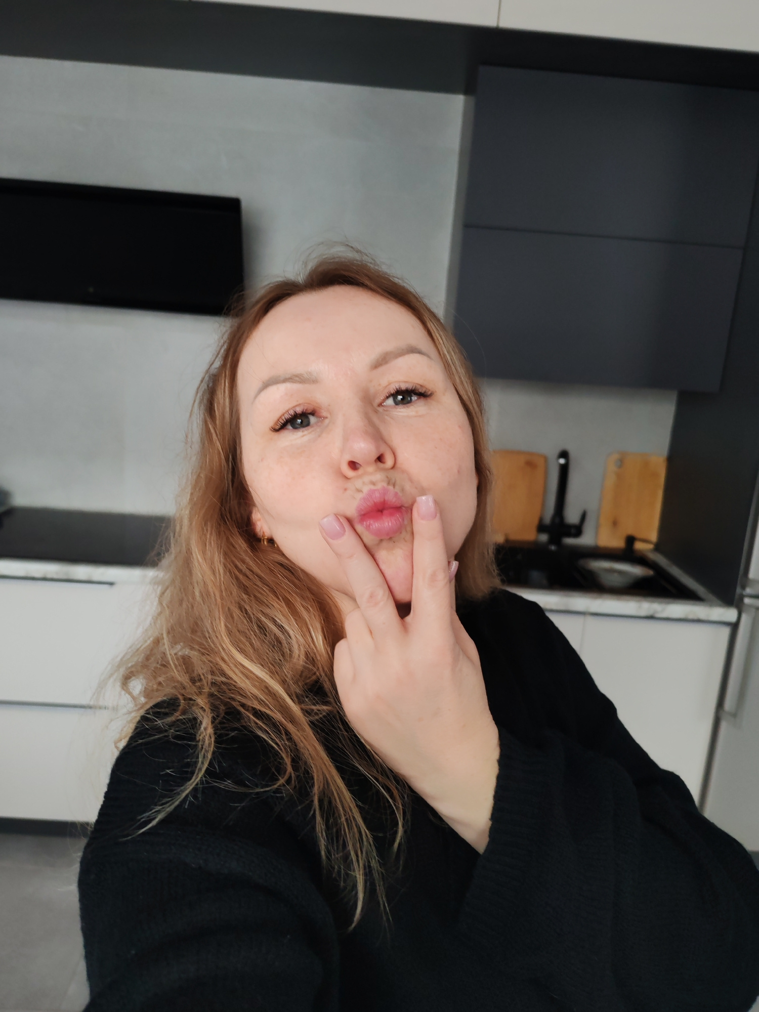 A woman is taking a selfie in what appears to be a kitchen. She has light skin, light brown hair, and is wearing a black sweater. She is puckering her lips into a "kiss" face and holding her index finβ¦read more