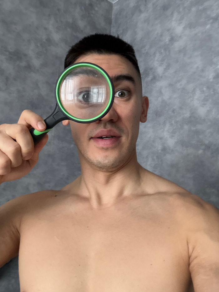 A bare-chested man holds a green-rimmed magnifying glass to his eye. The glass reflects what seems like a window. He gazes directly at the viewer with an intrigued expression. He is positioned from a…read more