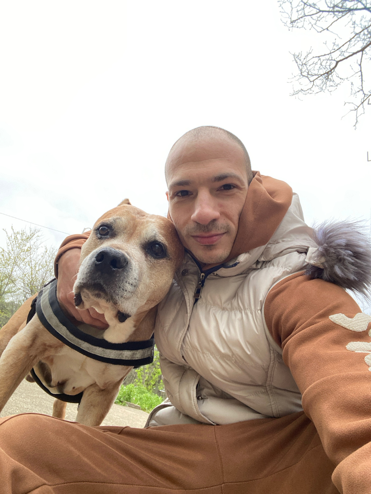 A selfie captures a man and a dog. The man has a shaved head, light skin, and is smiling at the camera. He is wearing a light brown hooded sweatshirt and a light colored puffy vest with a fur-lined ho…read more