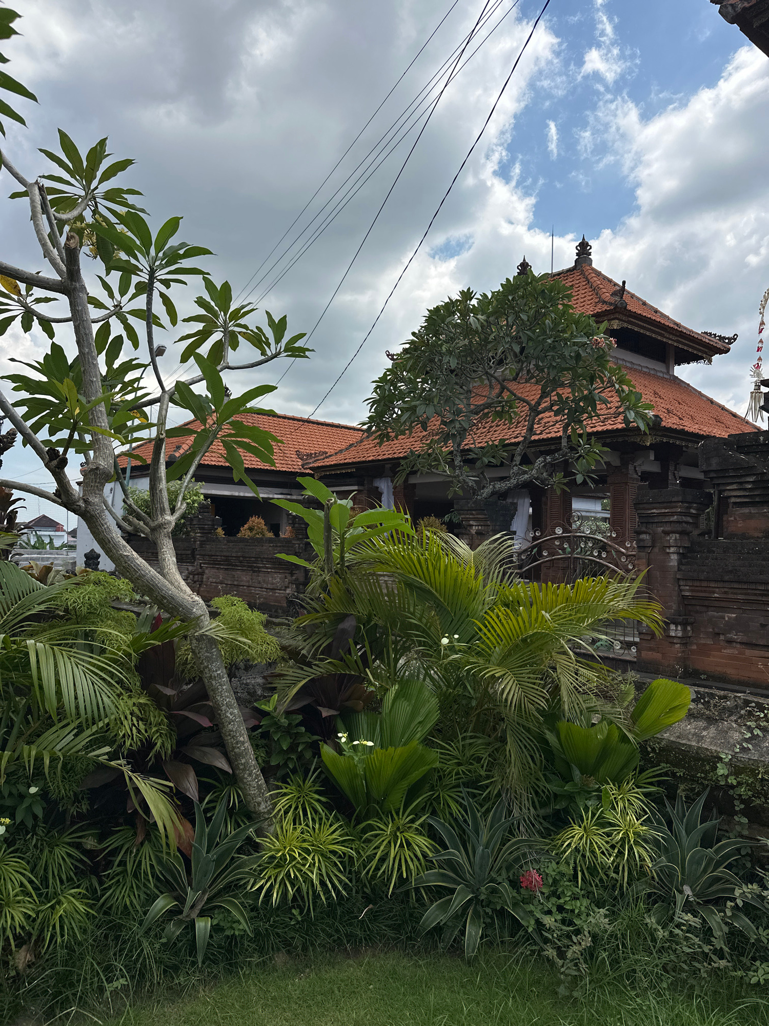 The image shows a traditional Balinese building with an orange tiled roof, set amidst lush tropical vegetation. The structure appears to be constructed of dark wood or brick, featuring intricate carviβ¦read more
