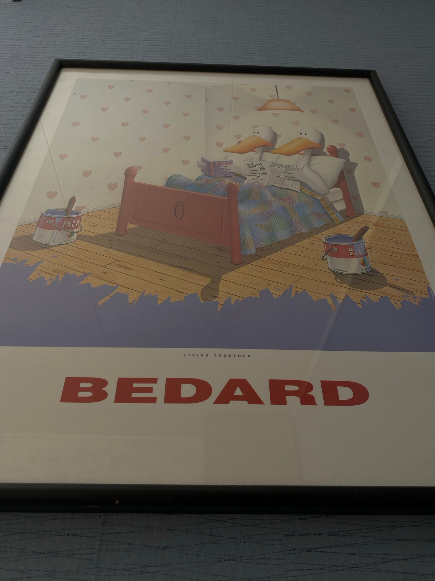 The image depicts a framed print of a whimsical illustration. The illustration shows two cartoon ducks in bed, reading a newspaper. The room is decorated with heart-patterned wallpaper. A can of paint…read more