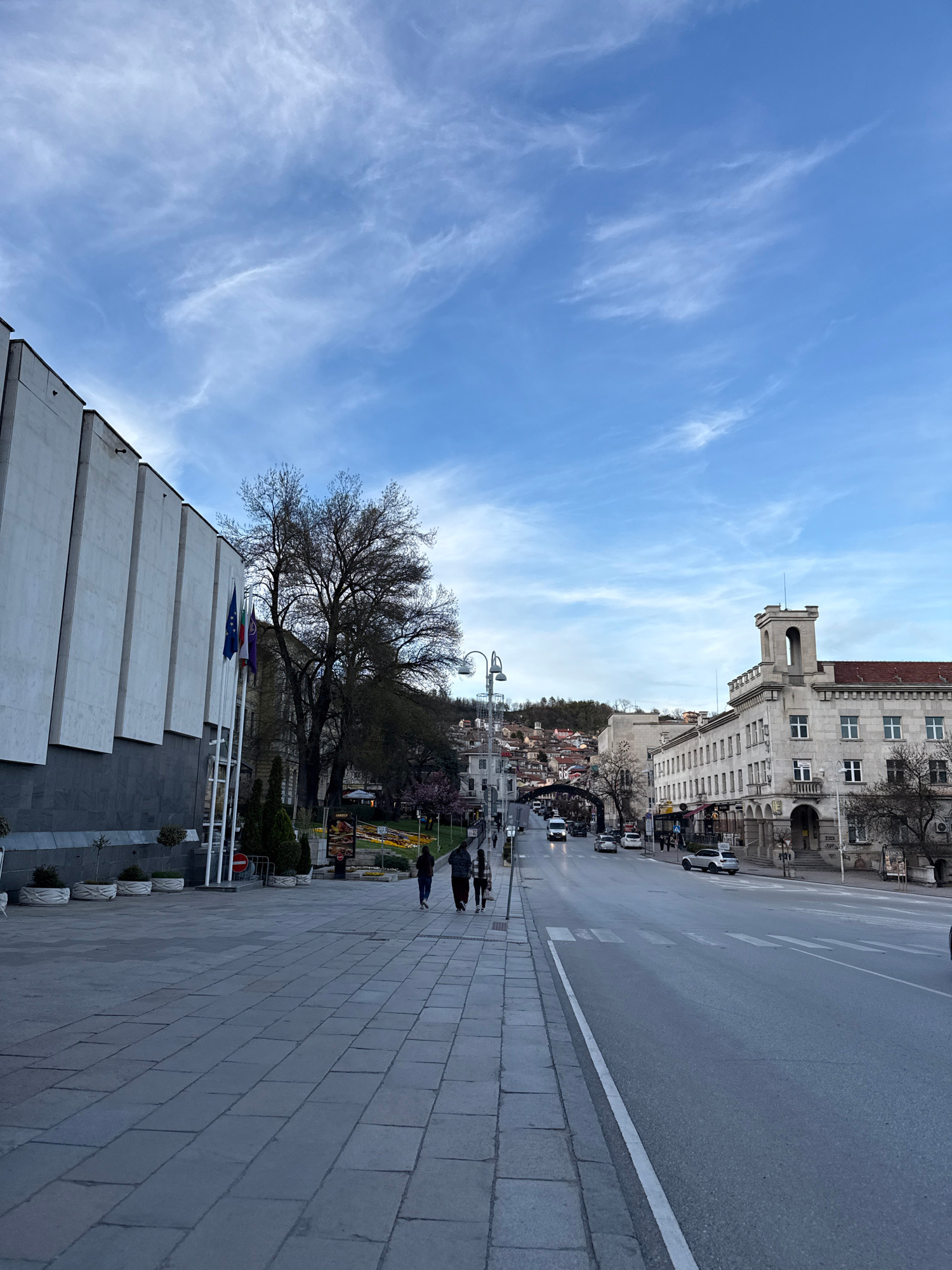 The image shows a street scene in Veliko Tarnovo, Bulgaria, under a partly cloudy blue sky. The foreground features a modern building with a flag display. Adjacent is a tree. The sidewalk leads to a r…read more