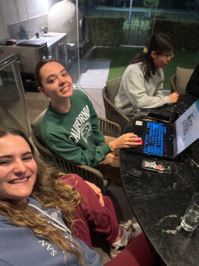 The scene depicts three individuals gathered around a dark, polished table within an indoor-outdoor living space, likely in San Bernardino Tlaxcalancingo, Mexico, during evening hours. In the foregrou…read more