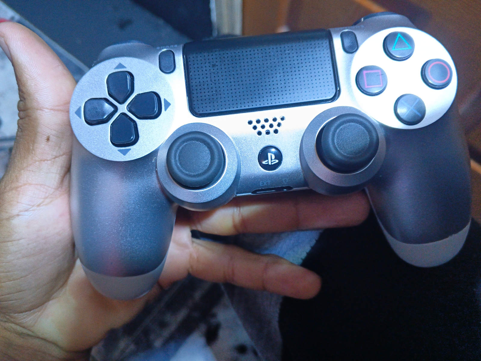 A hand holds a silver Playstation 4 Dualshock controller. The controller is in good condition, with all buttons and analog sticks visible. The location is unknown.