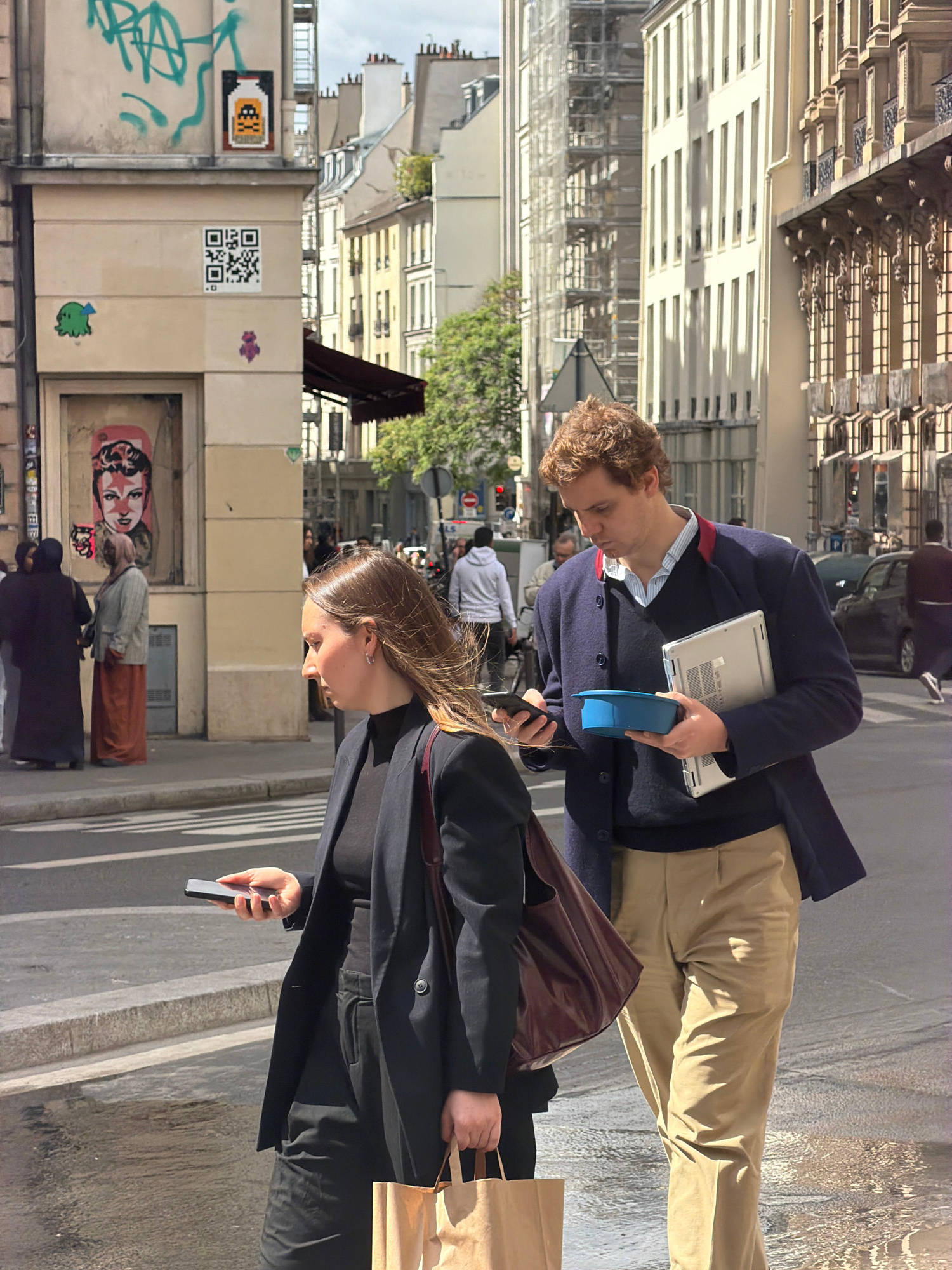 The image depicts a daytime street scene in what appears to be an urban setting like Paris, given the architectural style of the buildings. Two main individuals are walking in the foreground on a pave…read more