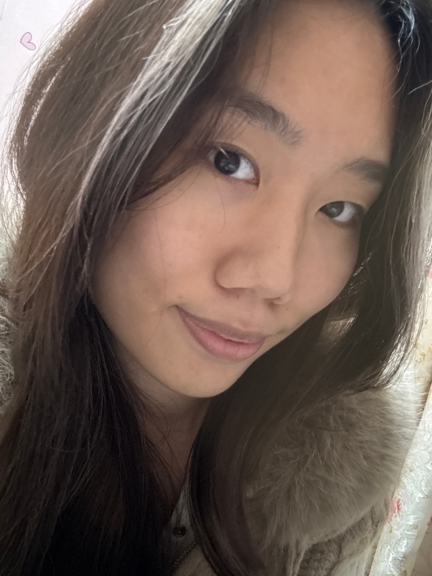 An indoor close-up image shows an East Asian female, framed from the upper torso upwards. She has long, dark brown hair with interspersed lighter strands, dark eyes, and a slight smile. Her gaze is di…read more