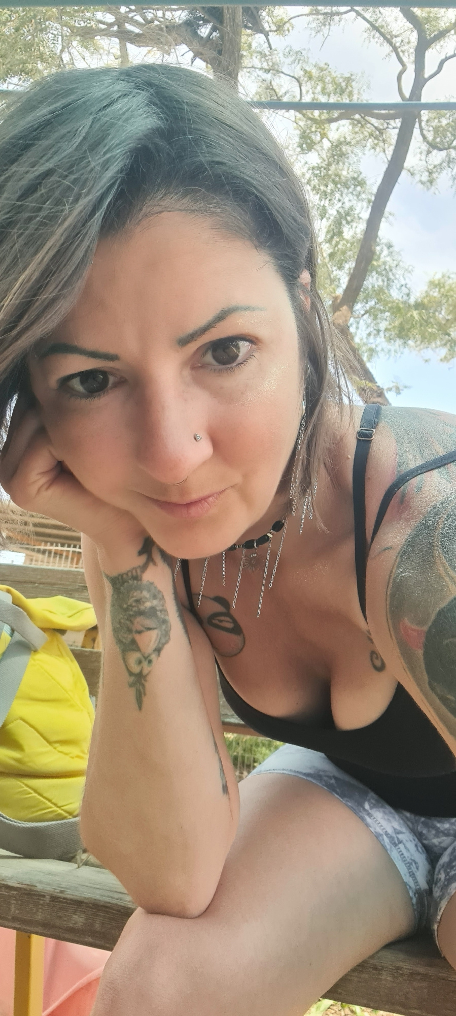 A woman with tattoos and gray hair is looking at the camera. She is wearing a black top and patterned shorts. She has a nose piercing and is wearing dangling earrings. Her left arm has a tattoo of an…read more
