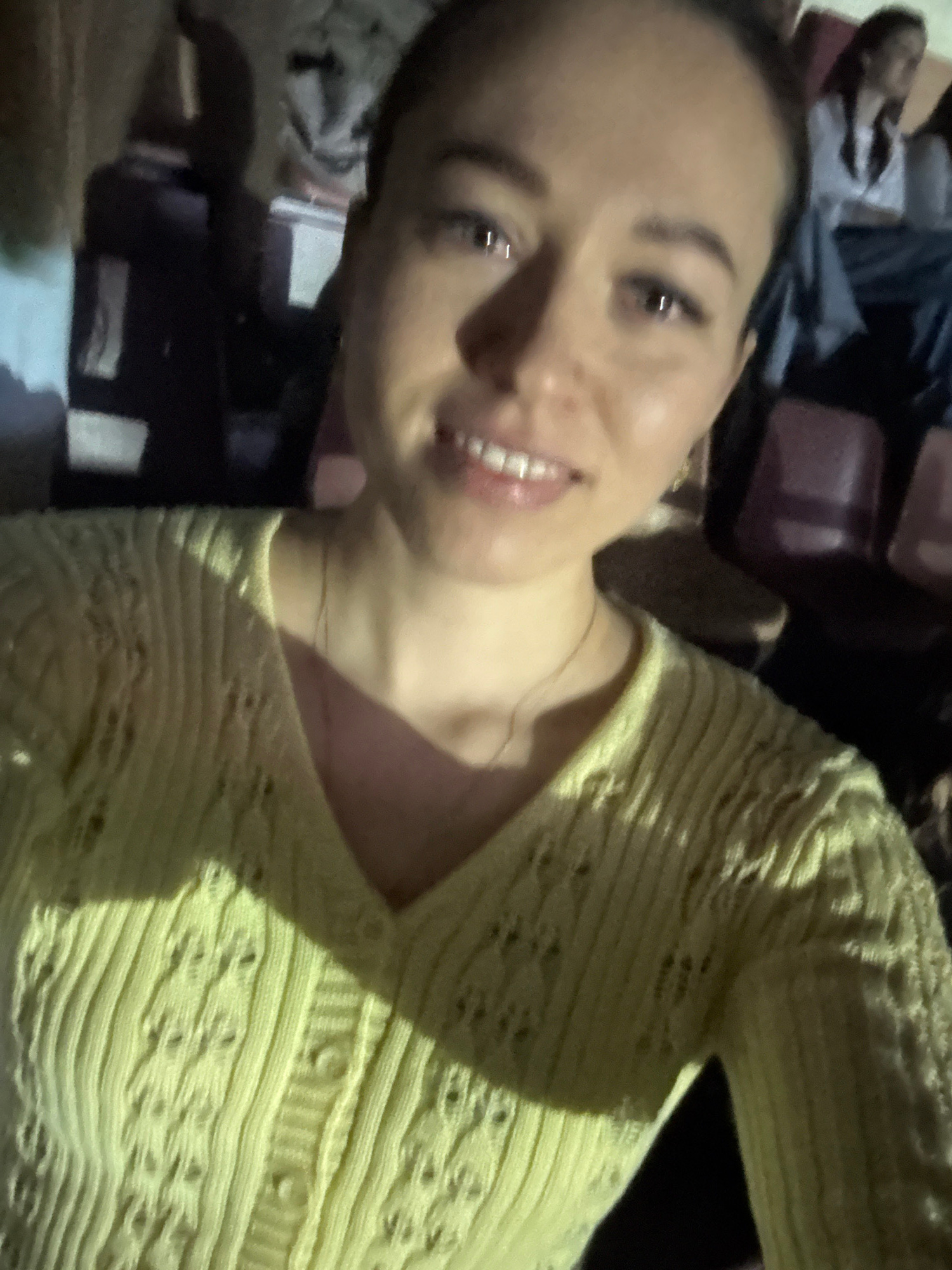 A person with light skin and dark hair is smiling and looking at the camera. They are wearing a yellow, textured v-neck top. The background appears to be a cluttered space with luggage or bags visible…read more