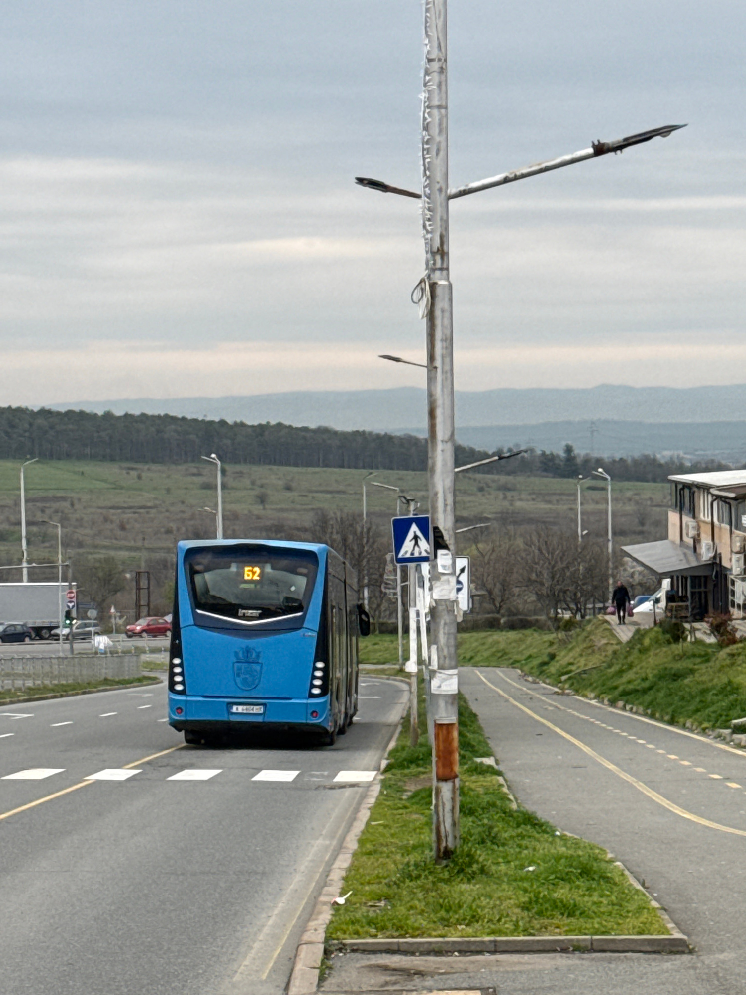 The image captures a blue city bus, displaying the number "52", navigating a road in Burgas, Bulgaria. The bus is positioned on the right side of the road, moving towards the camera. A pedestrian cros…read more