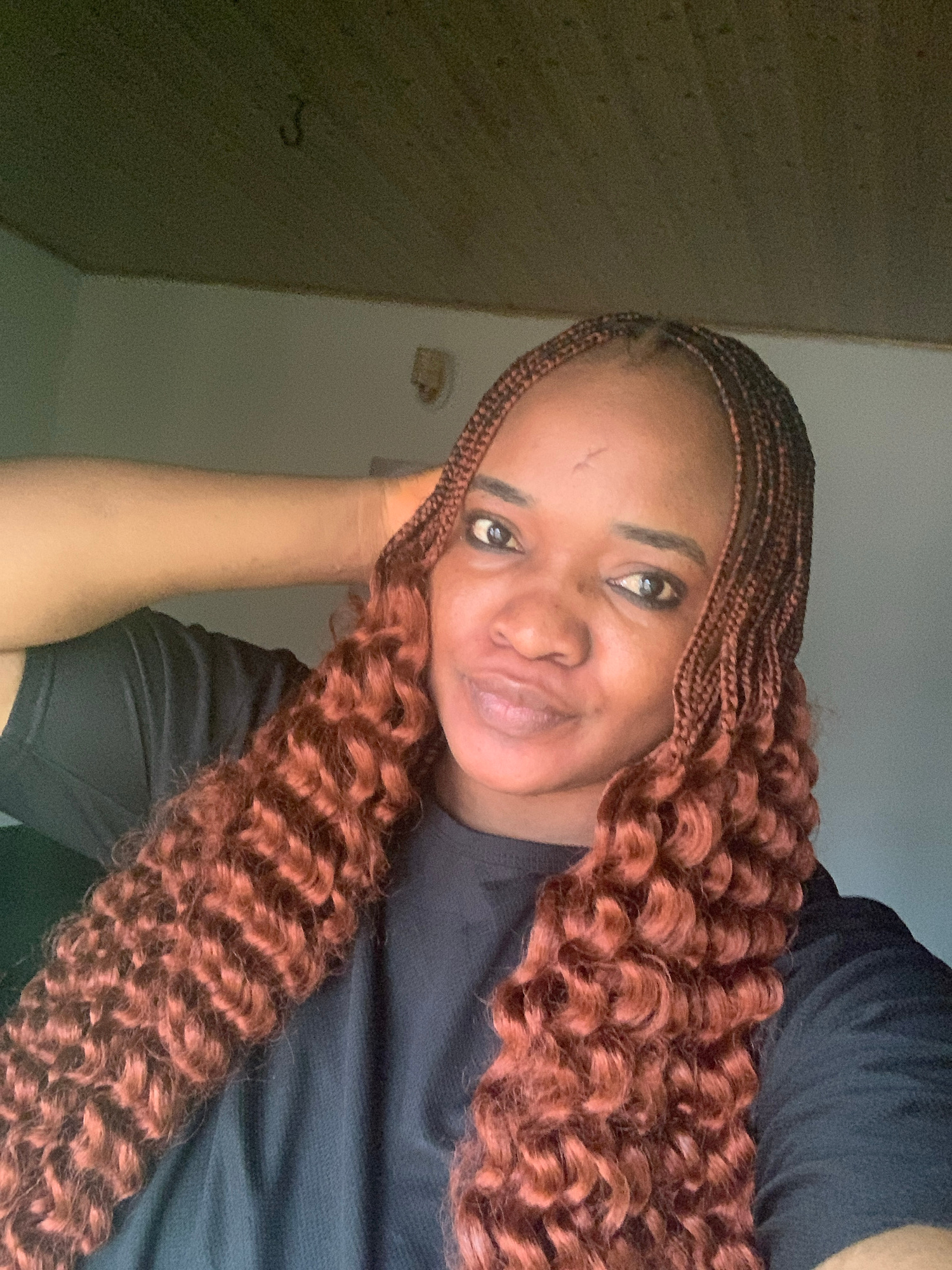 The image shows a woman with braided and curly reddish-brown hair, wearing a black shirt. She is leaning her head on her hand, and looking at the camera with a slight smile. The background is a plain…read more