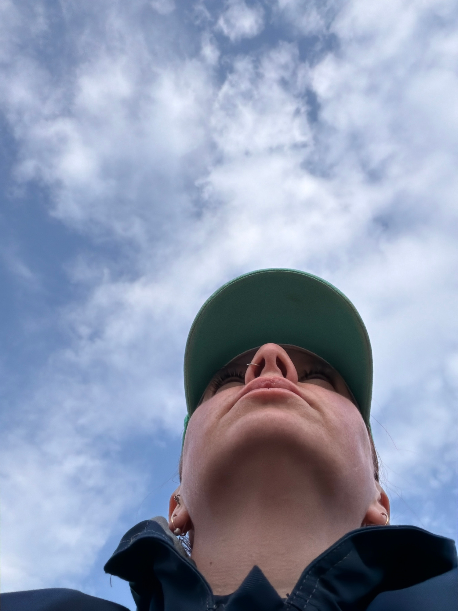A low-angle shot features a person wearing a green cap and a dark blue jacket, with a cloudy blue sky in the background. The person's face, specifically the nose, mouth, and chin, are prominently visiβ¦read more