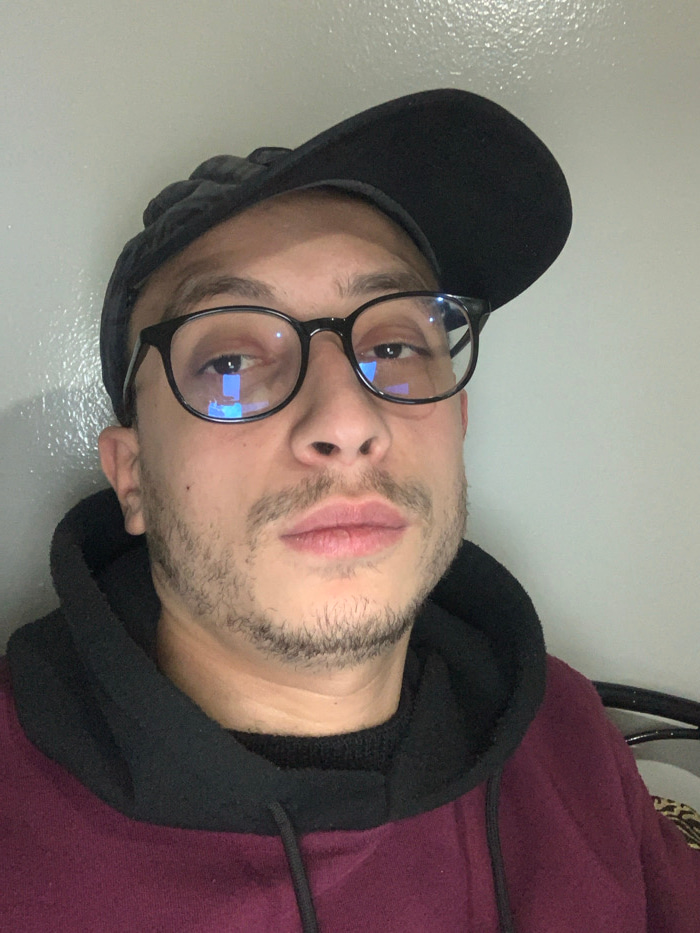 A man wearing glasses and a black baseball cap is facing the camera. He has a light beard and mustache. He is wearing a maroon hooded sweatshirt with a black hood liner. The background is a plain whit…read more