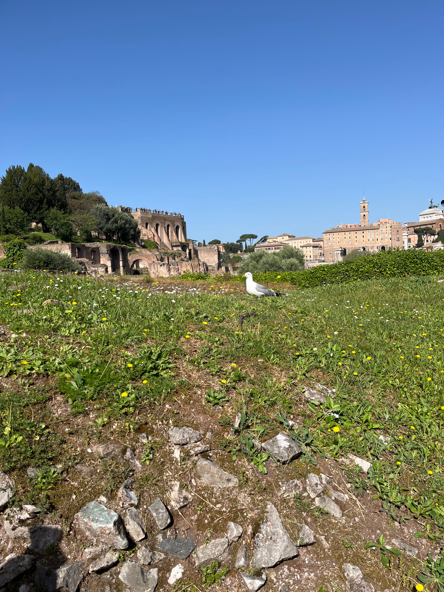 A landscape photograph captured on a bright day in Rome, Italy, depicts a scenic view from what appears to be the Palatine Hill, looking down towards the Roman Forum and surrounding city. In the immeβ¦read more