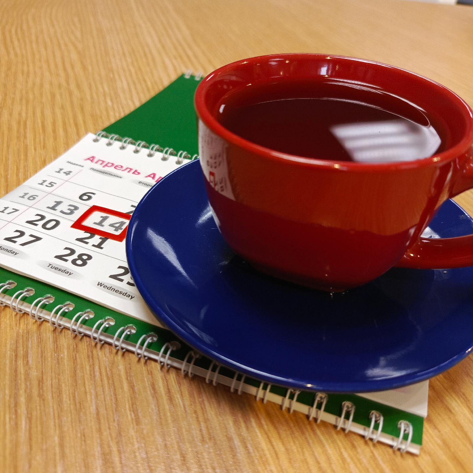 The image depicts a red cup filled with a dark liquid, resting on a blue saucer. The saucer is placed on top of a desk calendar with a green cover. The calendar is open to the month of April, and the…read more