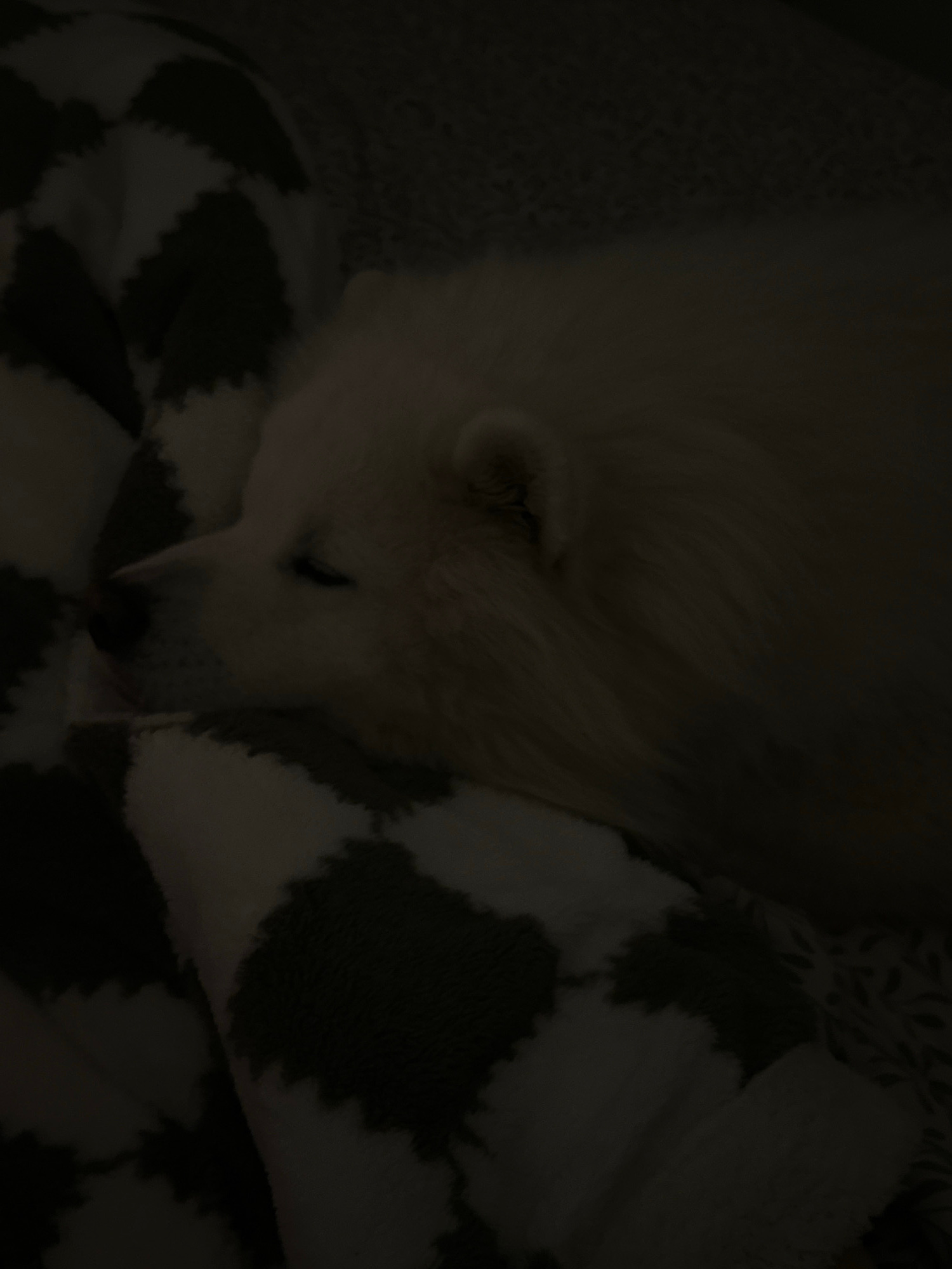 A white Samoyed dog is sleeping on a patterned blanket. The blanket features a large, irregular checkered pattern of white and dark squares. The background is dark, and the dog's white fur is a promin…read more