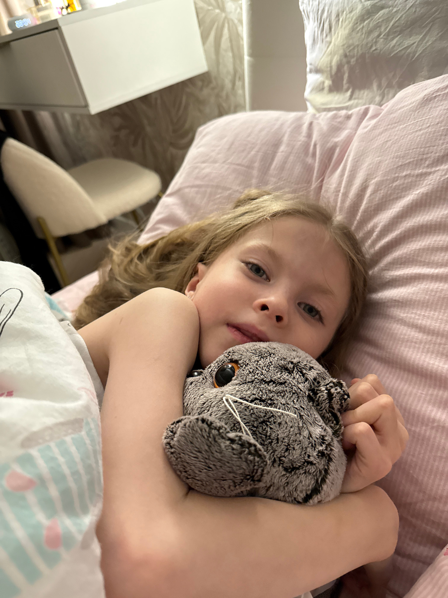 A young, light-skinned female child is lying in a bed. She is cradling a grey, plush owl toy. The bed has pink striped pillowcases and a white patterned blanket. A white bedside table is visible in th…read more