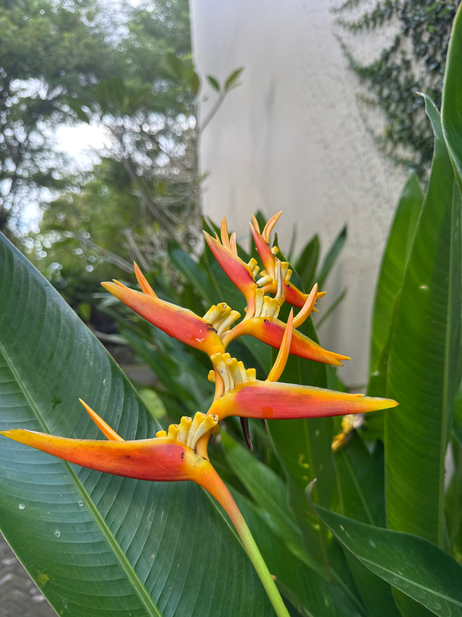 The image captures a close-up view of Heliconia psittacorum, commonly known as parrot's flower or false bird-of-paradise, in Kuta Selatan, Indonesia. The flower features vibrant red-orange bracts with…read more