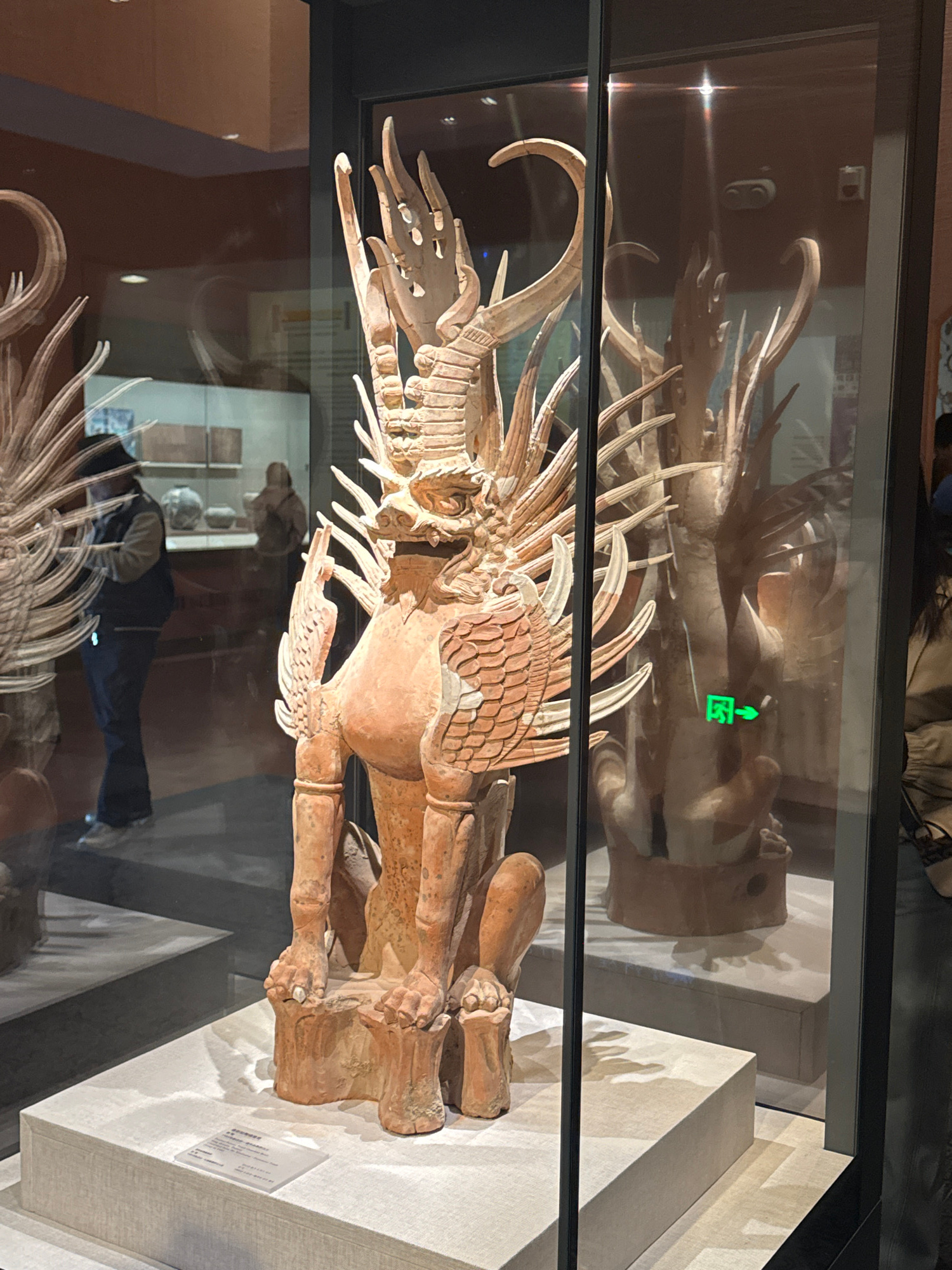 The image shows a terracotta sculpture of a mythological creature, possibly a guardian figure or chimera, displayed within a glass case in what appears to be a museum setting. The sculpture is a light…read more