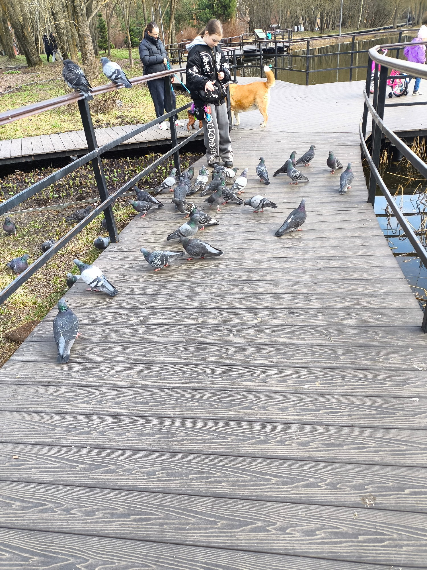 The image shows a group of pigeons on a wooden walkway. The walkway is elevated, and there is water on either side. There are people on the walkway, including a woman with a dog. The location is most…read more