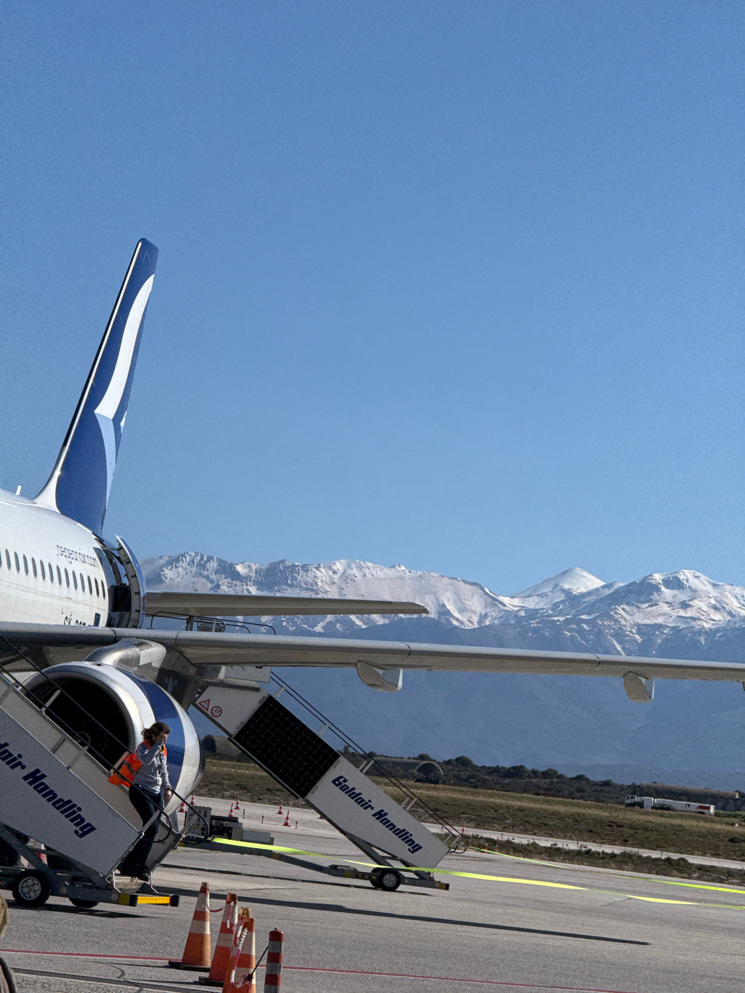 The image captures an airplane parked on the tarmac at Chania International Airport in Kounoupidiana, Greece. The aircraft is fitted with mobile stairs labeled "Goldair Handling," and an individual we…read more