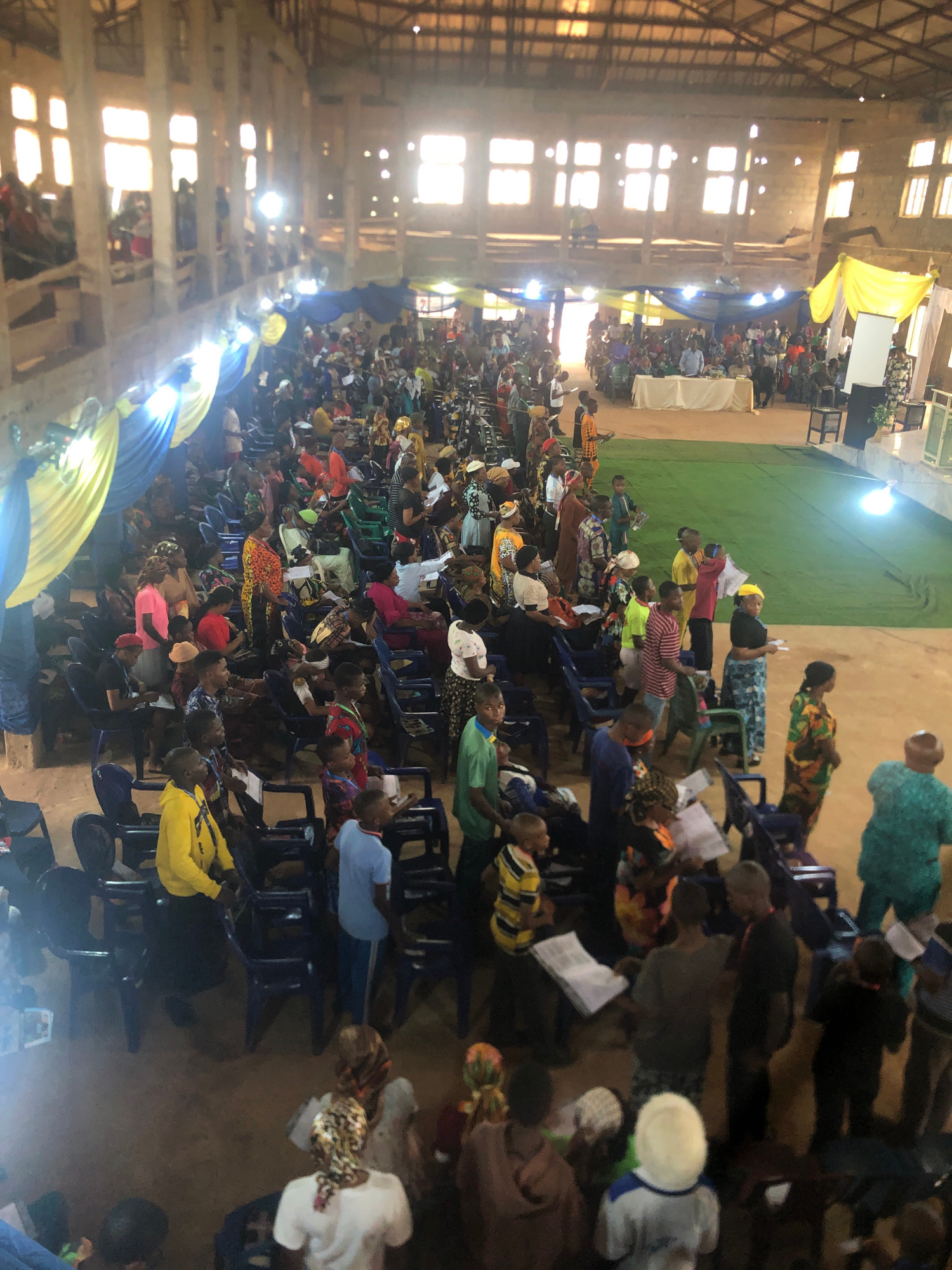 The image shows a large group of people gathered indoors in Obosi, Nigeria. They are seated in rows of blue plastic chairs, filling most of the space. The setting appears to be a large hall with a hig…read more
