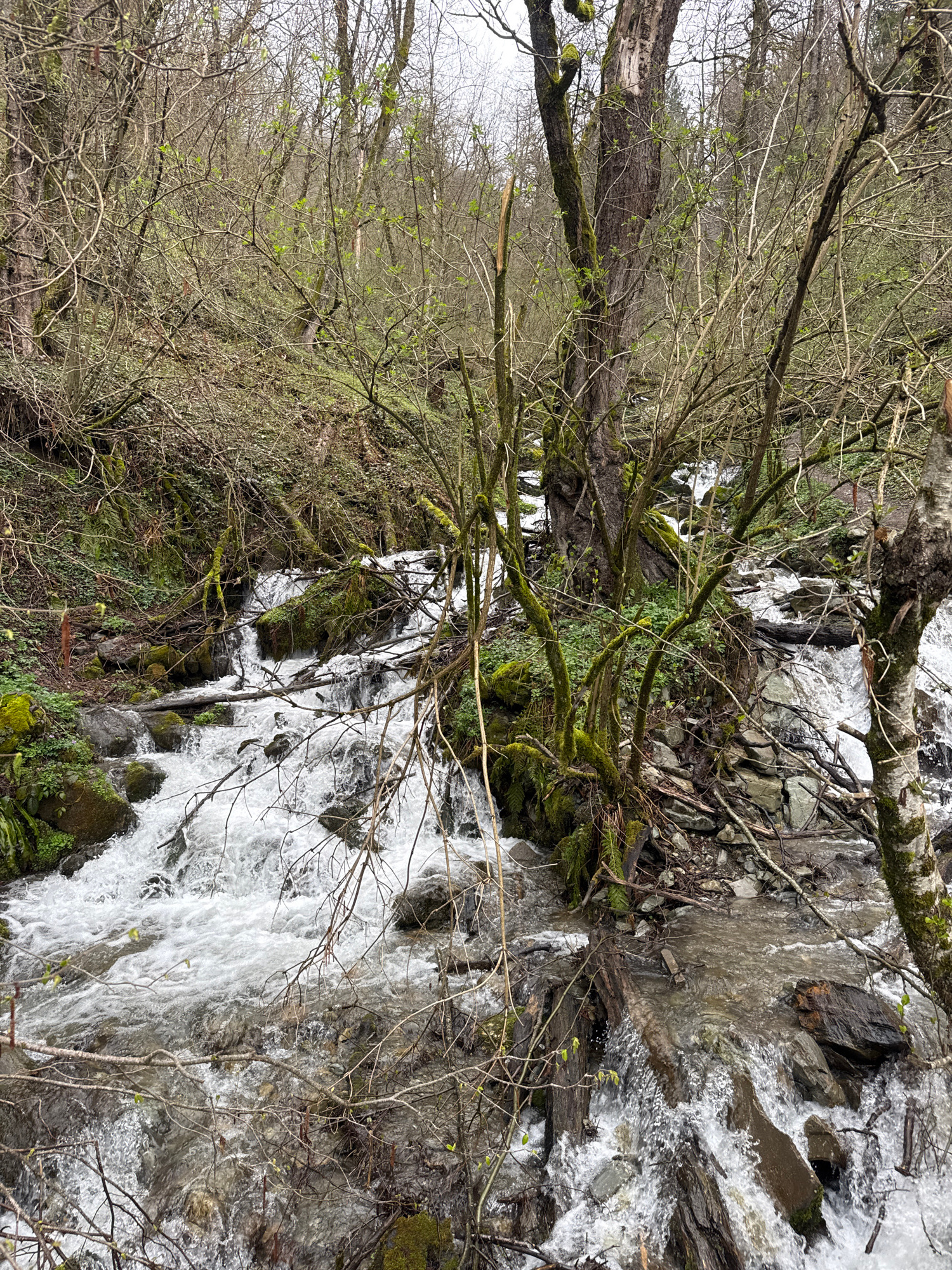 The image depicts a cascading waterfall in a natural environment, possibly located in Krasnaya Polyana, Russia, given the reference. The waterfall flows over rocks and stones, surrounded by bare trees and vegetation. Moss covers branches and rocks near the water. No people are visible. The environment appears damp and cool. | Open Wire