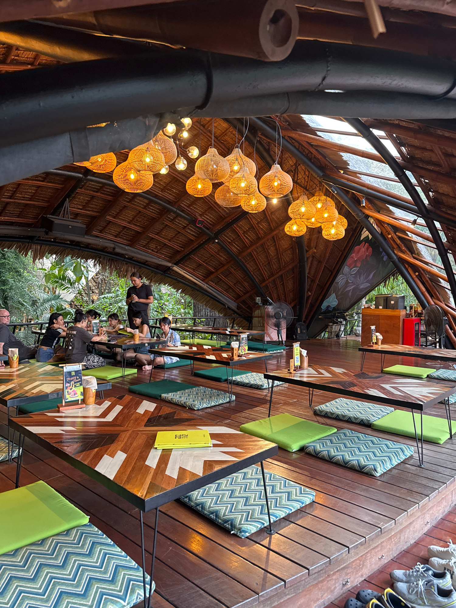 This media depicts the interior of a casual, open-air restaurant or cafe in Wichit, Thailand, characterized by a unique architectural style. The high, arched ceiling is constructed from a thatched roo…read more