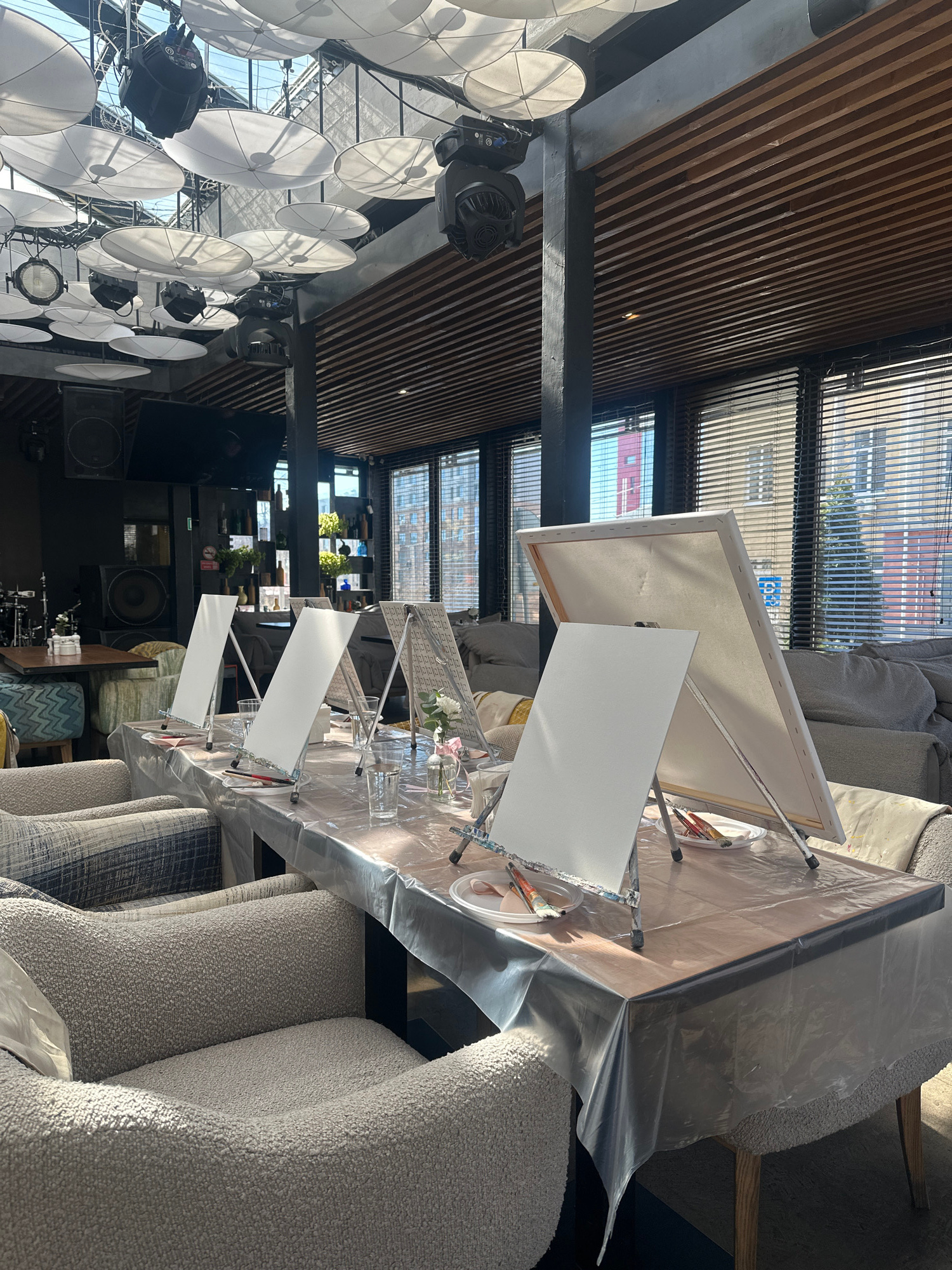 The image shows a room prepared for a painting event, possibly a class or social gathering. A long table is covered with a clear plastic sheet, likely to protect it from paint spills. Easels stand on…read more