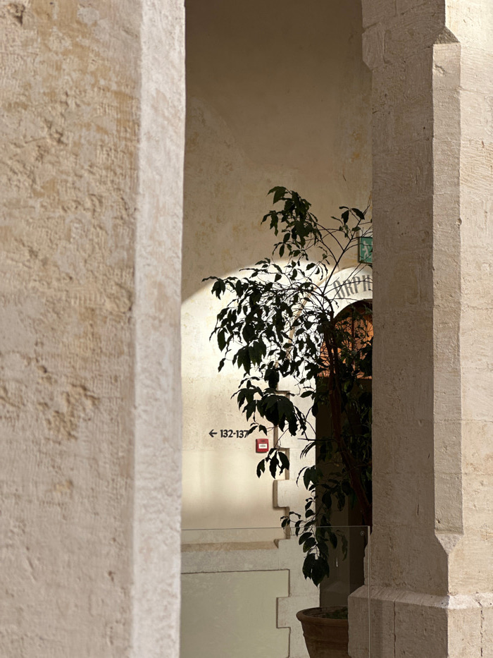 The image depicts an interior or semi-enclosed courtyard within a historic stone building, framed by two prominent light-colored, roughly-hewn stone columns or pillars. The location is consistent with…read more