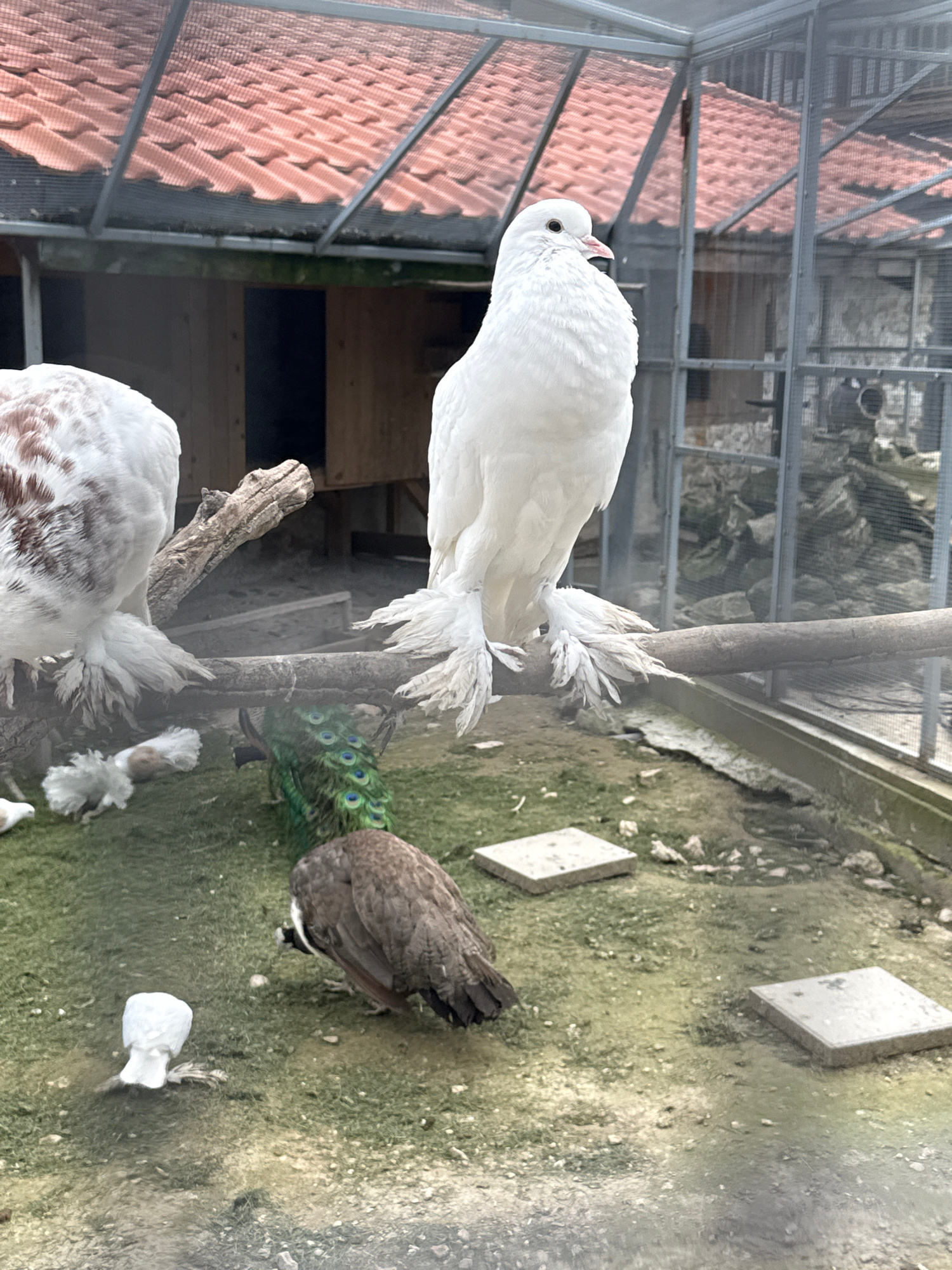 The image shows a variety of birds in an enclosure, likely at the "Egzotichni Ptitsi" (Exotic Birds) in Mramor, Bulgaria. In the foreground, two Fantail pigeons are perched on a branch. One pigeon is…read more