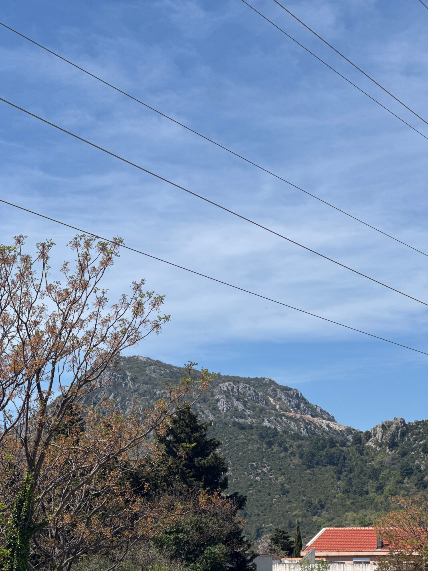 The image shows a view in Sutomore, Montenegro. The composition is roughly divided into two sections. The left side features a light blue sky with faint clouds and several diagonally oriented power li…read more