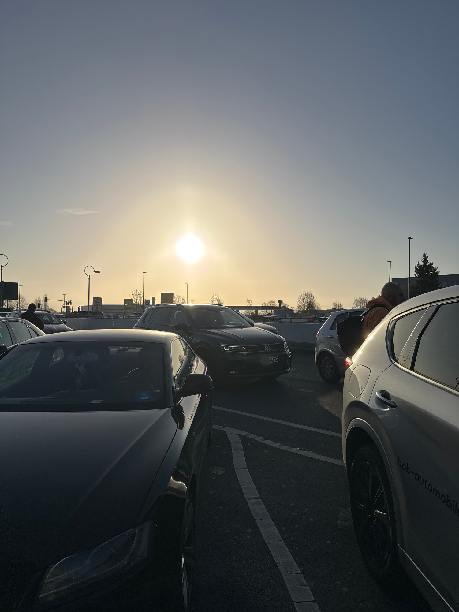 The image shows a parking lot scene in Dortmund, Germany during daylight. Several cars are parked. A person is standing next to a white car, possibly entering or exiting. The sun is high in the sky, c…read more