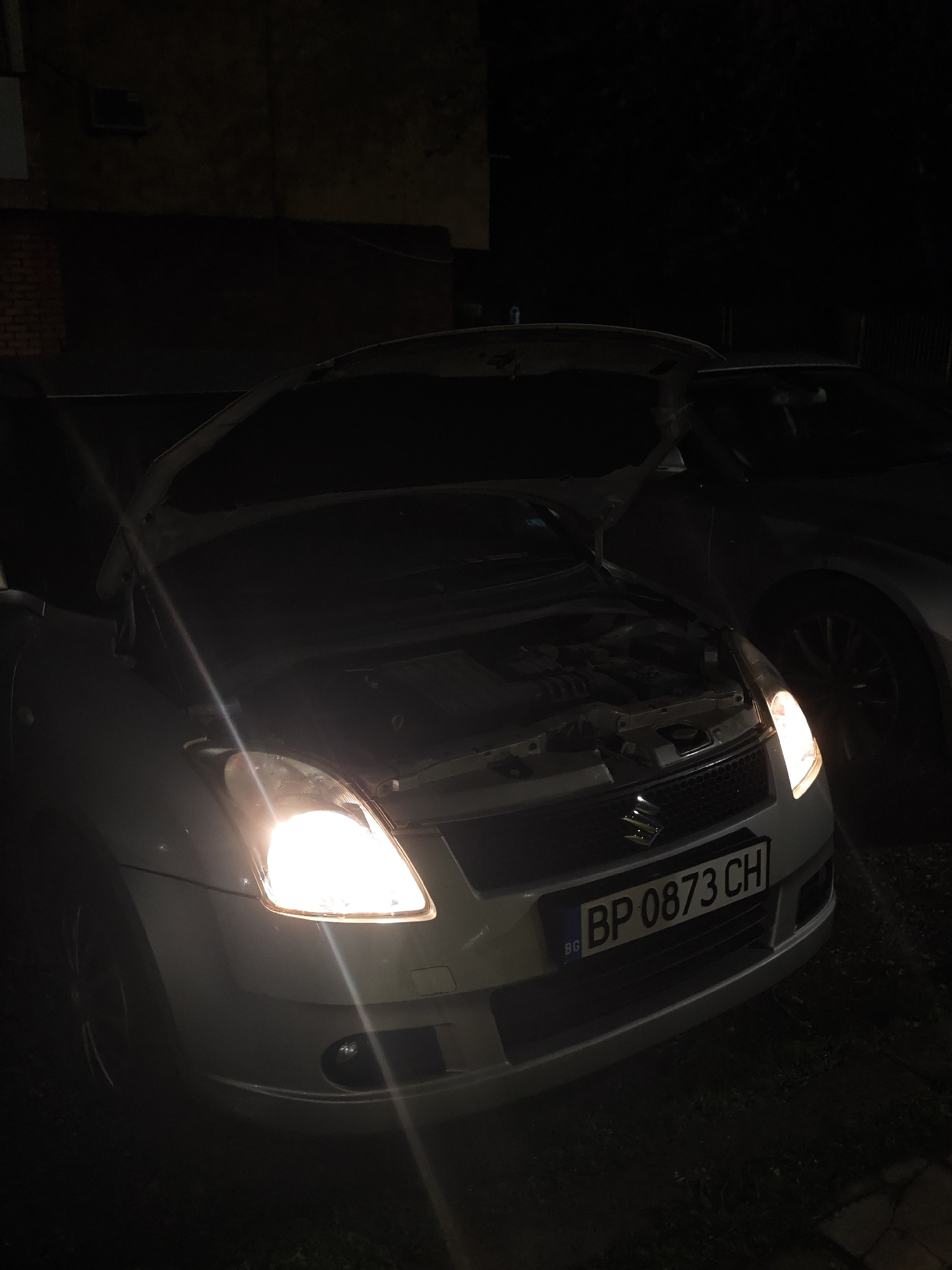 A nighttime scene depicts a white Suzuki Swift car with its hood open and headlights illuminated. The license plate reads "BP 0873 CH," indicating registration in Bulgaria. The car is parked next to a…read more