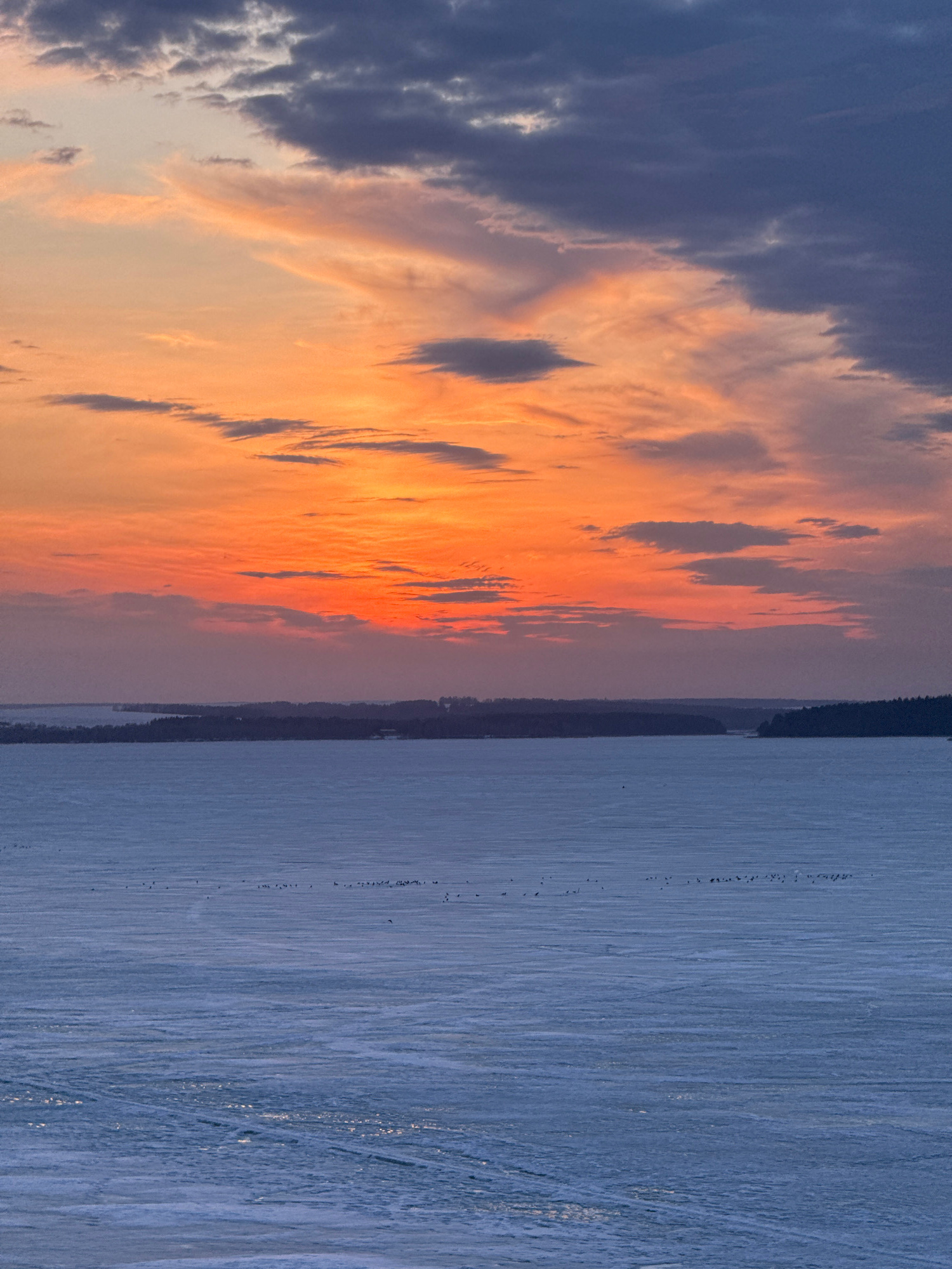 The image displays a landscape divided into two distinct sections. The left side of the image shows a vibrant sunset with hues of orange and yellow streaking through the sky, mixed with dark, cloudy f…read more