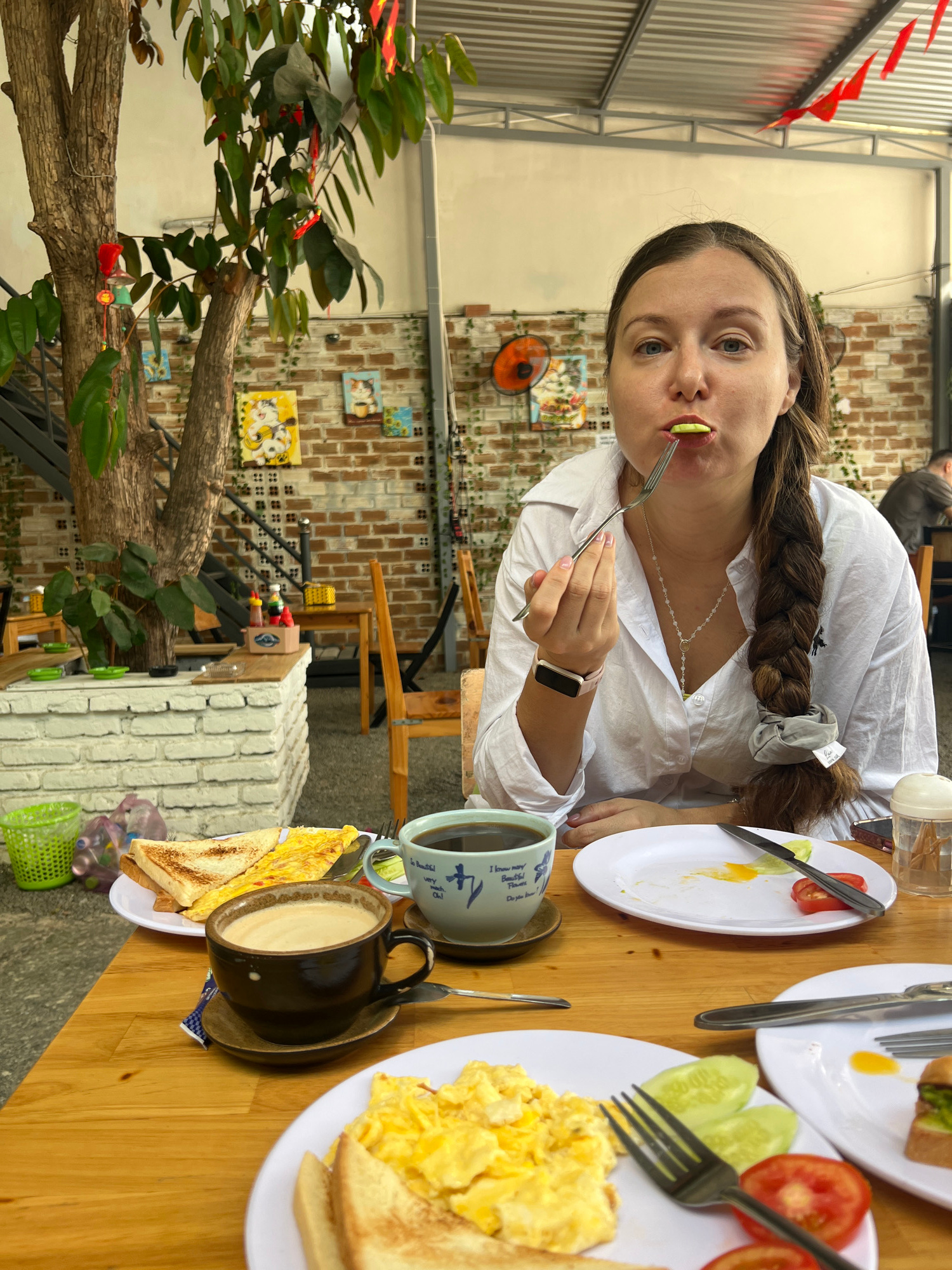 The image shows a woman with light skin and brown hair braided with a grey scrunchie eating with a fork. She is wearing a white shirt. The food consists of eggs, toast, tomatoes, and cucumbers. There…read more
