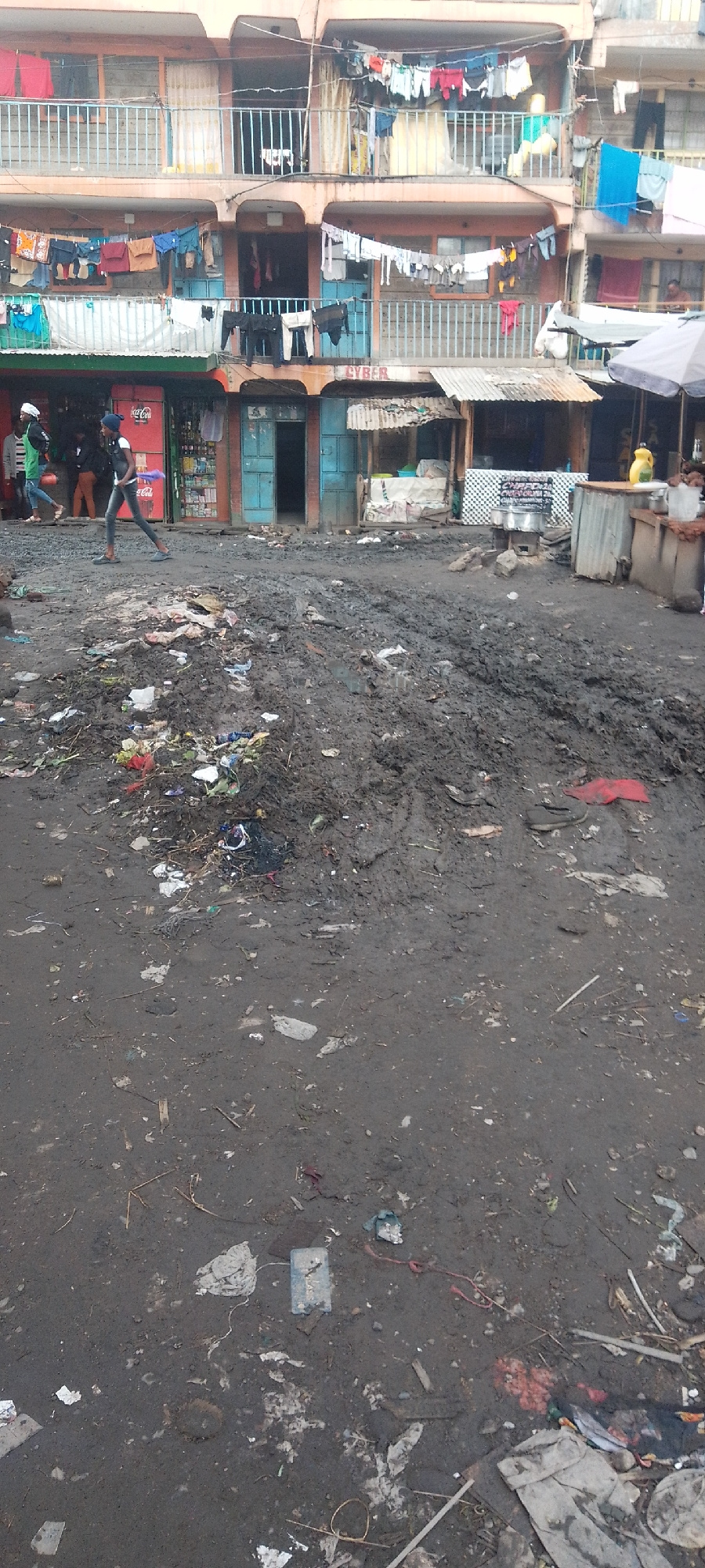 The image depicts a crowded, multi-story residential and commercial area characteristic of an informal settlement or low-income urban environment within Nairobi, Kenya. The foreground is dominated by…read more