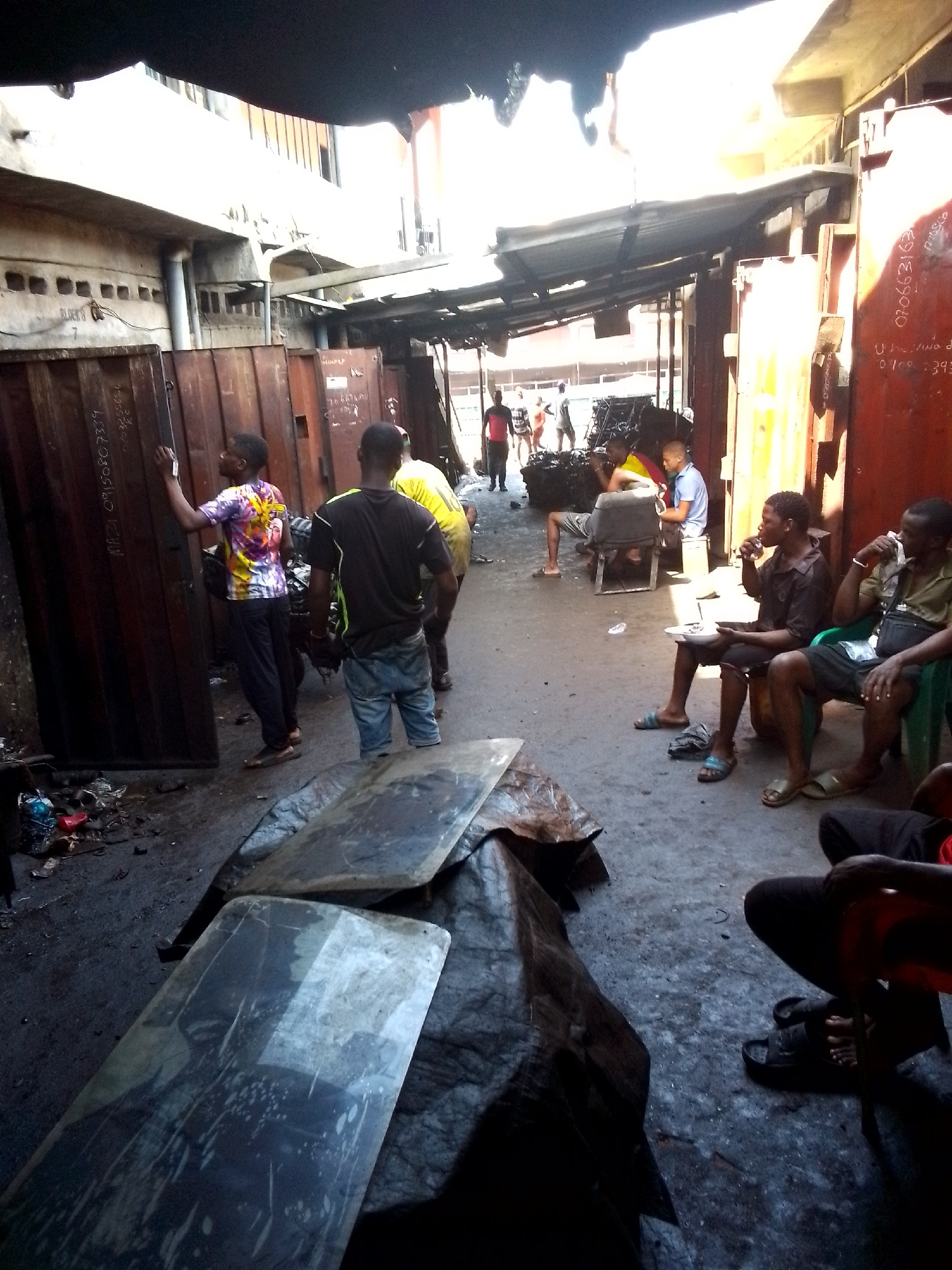 This image depicts a bustling outdoor scene, likely a market or commercial alleyway, in Onitsha, Nigeria, under bright, clear daylight. The environment features rough ground, possibly dirt or worn con…read more