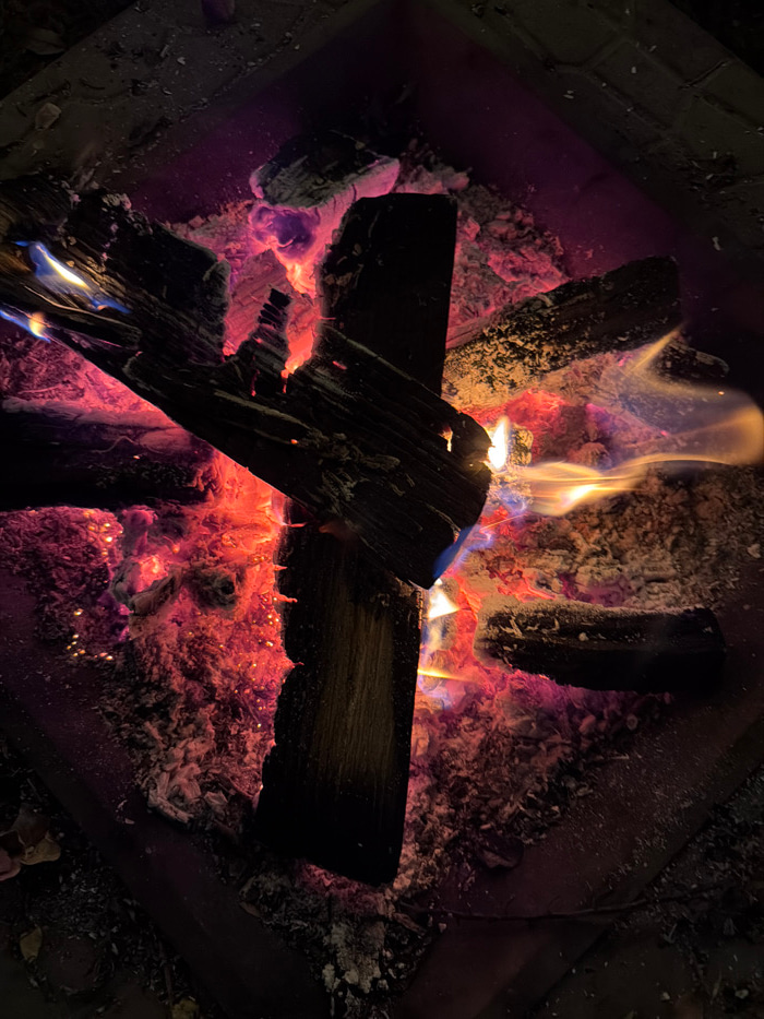 The image displays an overhead, close-up view of an active fire contained within a dark, square or rectangular fire pit, located in Huixquilucan de Degollado, Mexico. Multiple pieces of wood, appearinβ¦read more