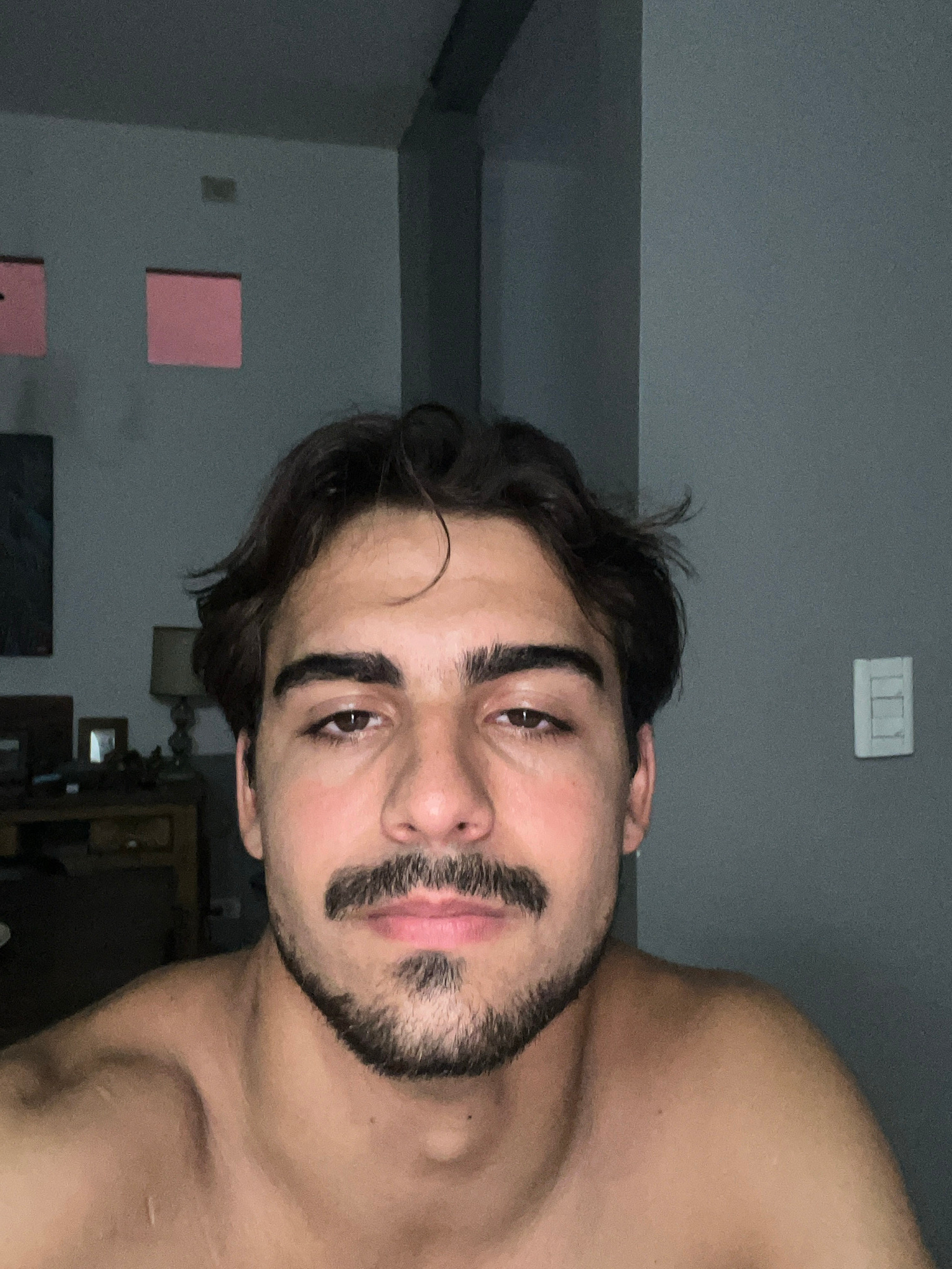 A close-up, indoor shot shows a shirtless man with dark hair, a beard, and brown eyes. He faces the camera with a neutral expression. The background includes a gray wall with a light switch and pink s…read more