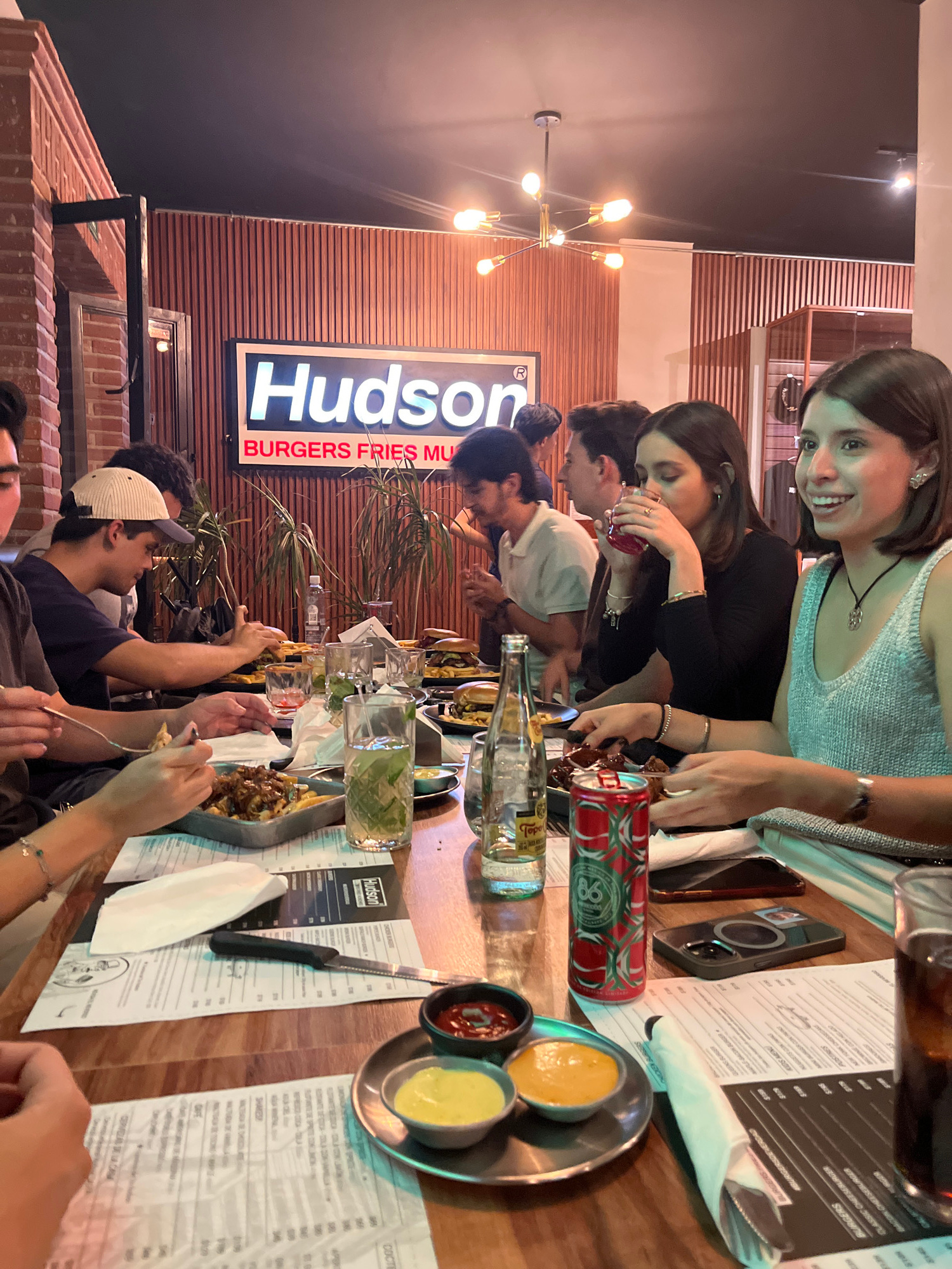 A group of people is gathered around a wooden table at a restaurant named Hudson, which is located in San Andrés Cholula, Mexico. The restaurant's sign is visible in the background, displaying "Hudson…read more