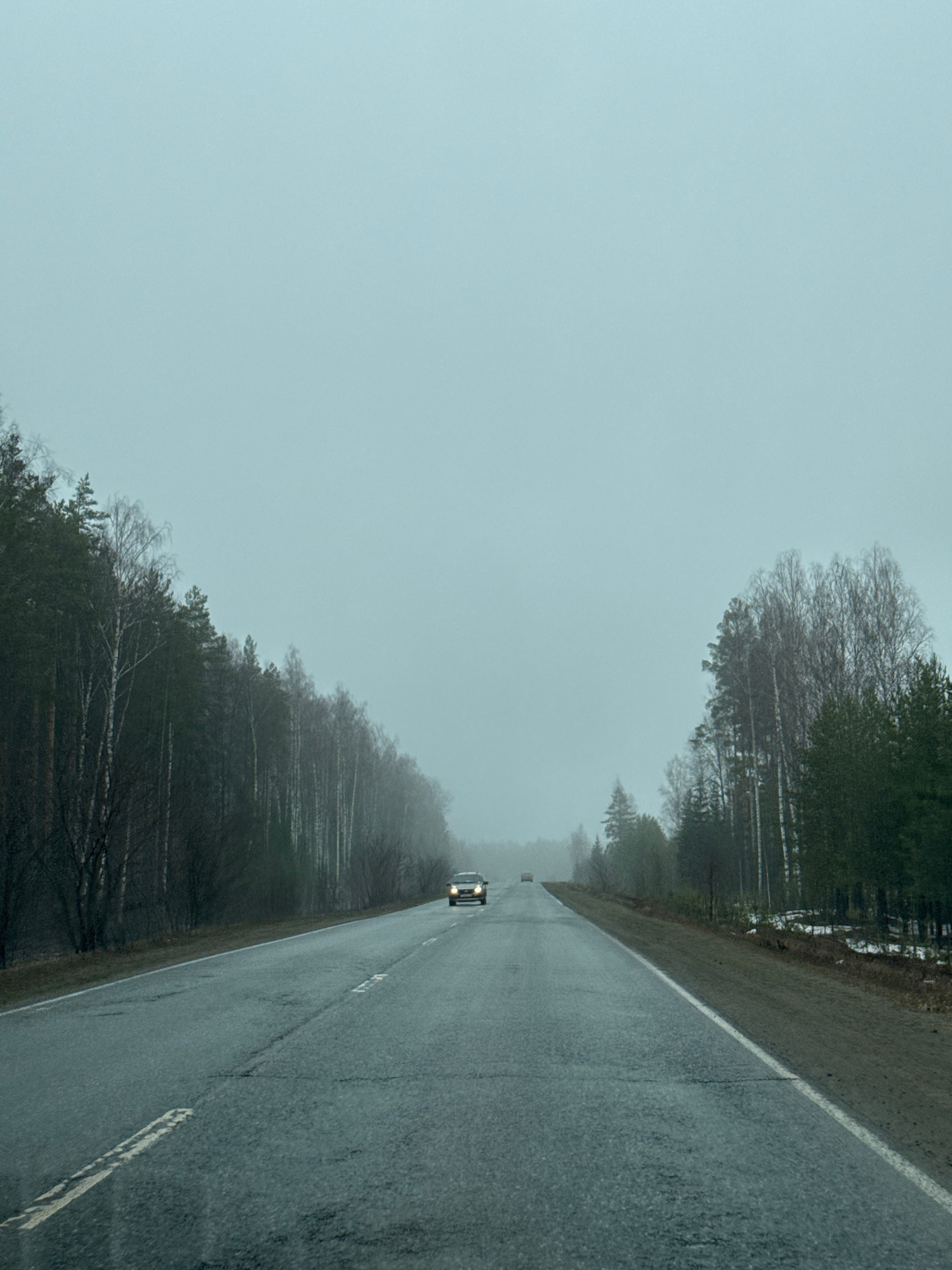 The image shows a road in a foggy, overcast environment. A car is visible on the road in the distance. Both sides of the road are lined with trees. There is no indication this photo was taken in Novyi, Russia. | Open Wire