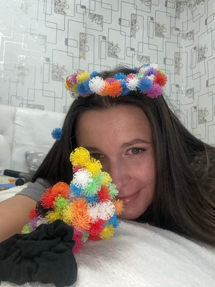 The image displays a close-up of a young woman's face and upper body, photographed with a tilt, giving the impression that she is reclining. Her long, dark brown hair cascades around her head and shou…read more
