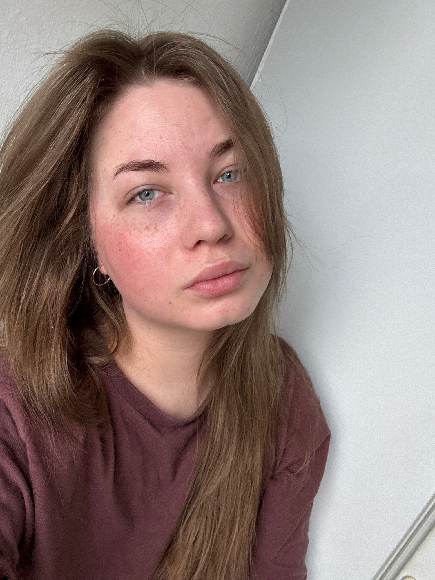 A woman with light brown hair, blue eyes, and fair skin with freckles is positioned at an angle, facing the camera. She is wearing a maroon t-shirt and a gold hoop earring. The background consists of…read more