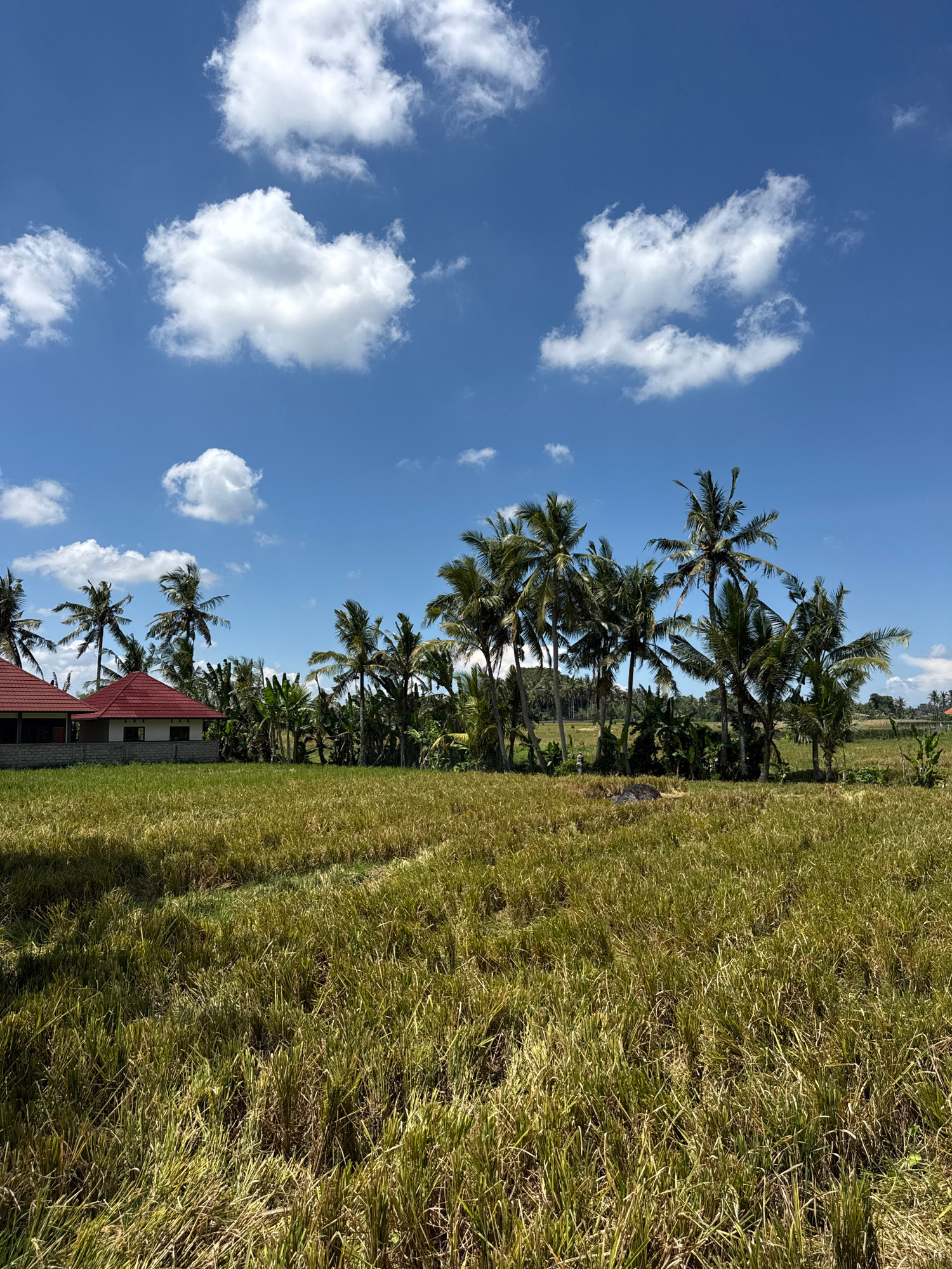 The image captures a landscape in Gubug, Indonesia, under a clear blue sky dotted with fluffy white clouds. The foreground is dominated by a field of golden-brown rice stalks, likely ready for harvest…read more