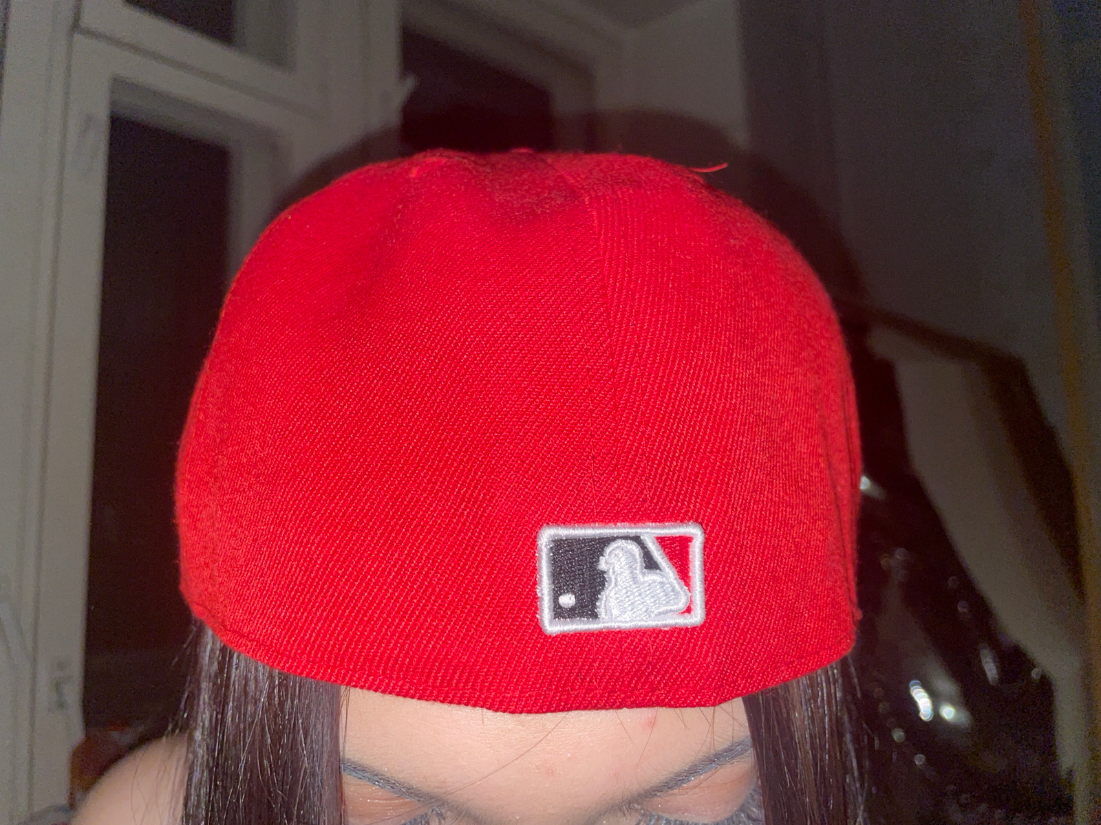A person wearing a red baseball cap with the MLB logo is partially visible. The person's dark hair and eyes are visible beneath the cap. The background includes a window frame and a dark, indistinct a…read more