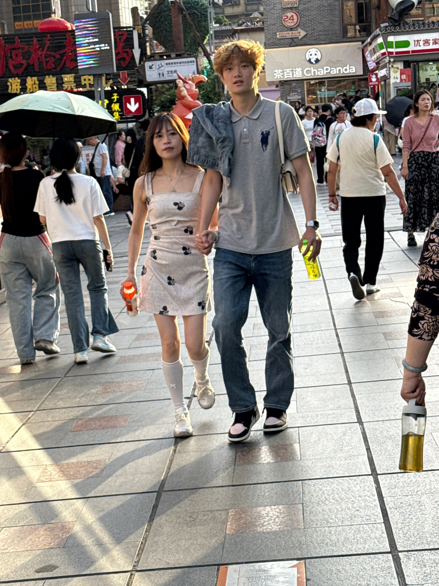 This image captures a vibrant street scene in what appears to be a commercial district, likely in Yuzhong District, China, during the late afternoon or early evening, indicated by the long shadows and…read more