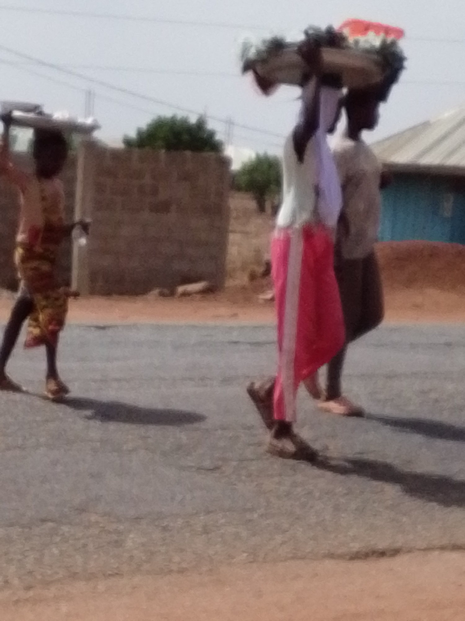Three people walk along an asphalt road in Dungu, Ghana. Two individuals carry loads on their heads. The person closest to the camera wears pink pants with a white stripe, a light-colored shirt, and b…read more